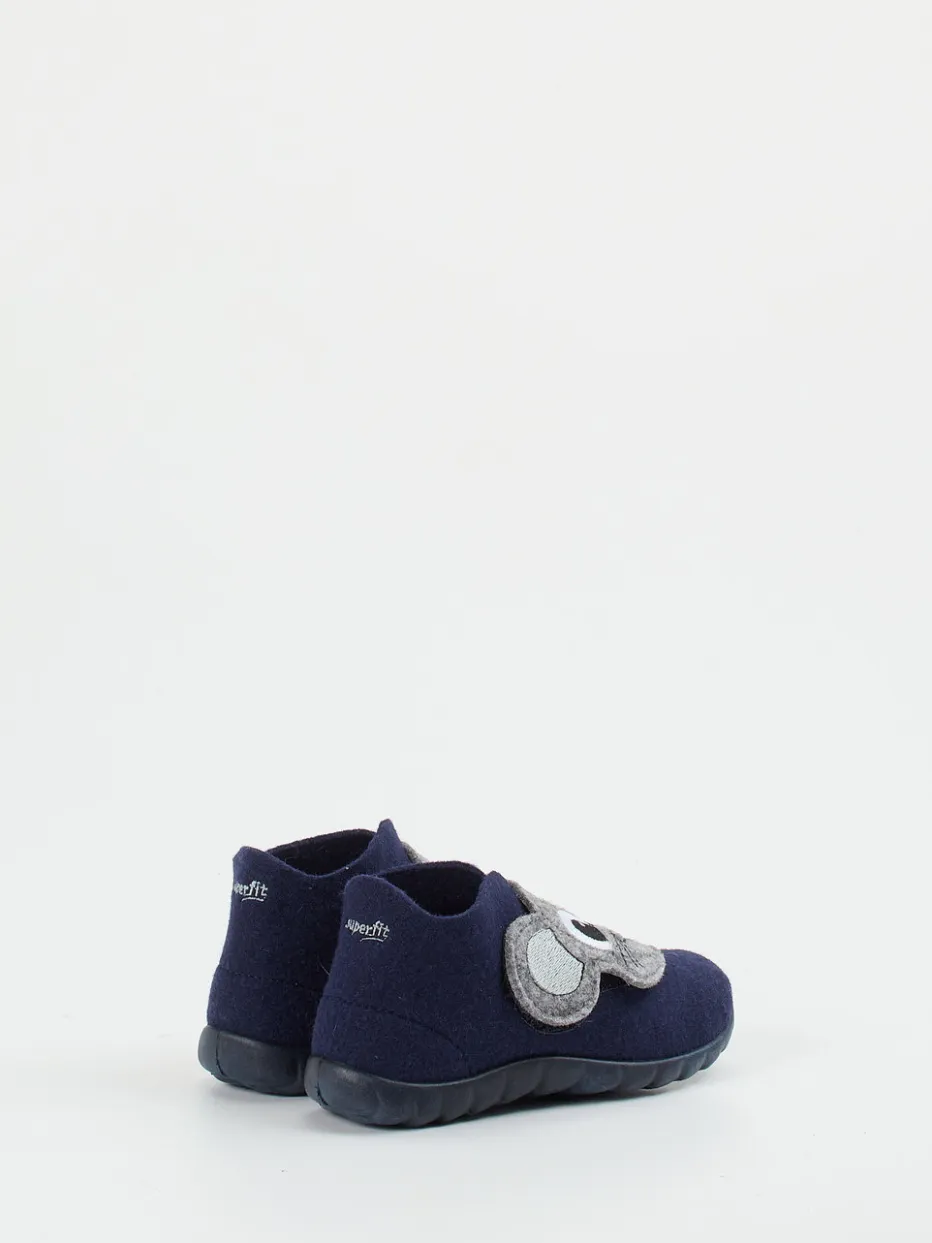 Freche Maus trifft Funktionalität.Superfit präsentiert einen liebevoll gestalteten Kinderhausschuh für den Alltag und entspannte Stunden daheim. Ideal für Kita oder Zuhause bietet die knöchelhohe Form Halt bei maximaler Bewegungsfreiheit. Gefertigt aus dunkelblauer Wolle mit filziger Oberfläche überzeugt das Modell durch warme Textilfütterung und kindgerechtes Design. Die Maus-Applikation aus Stickerei und Stoff ist Blickfang und Verschluss zugleich – der Klettverschluss erleichtert das An- und Ausziehen. Die profilierte PU-Sohle unterstützt sicheres Abrollen auf rutschigen Böden. Inspiriert vom Trendthema Animal Motifs Kids AW24, lädt das Storytelling-Design zum Träumen ein. Ein durchdachtes Superfit-Modell mit alltagstauglichem Komfort und spielerischer Note.