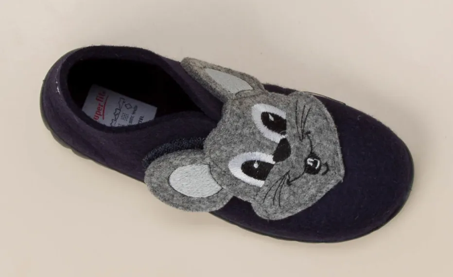 Der Kinderhausschuh von Superfit überzeugt durch warmes Wollmaterial und eine spielerisch gestaltete Maus-Applikation, die zugleich funktional als Klettverschluss dient.
