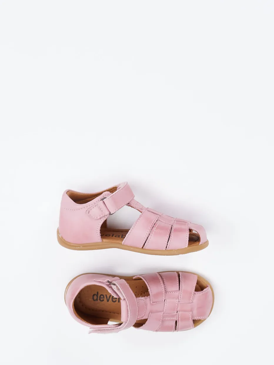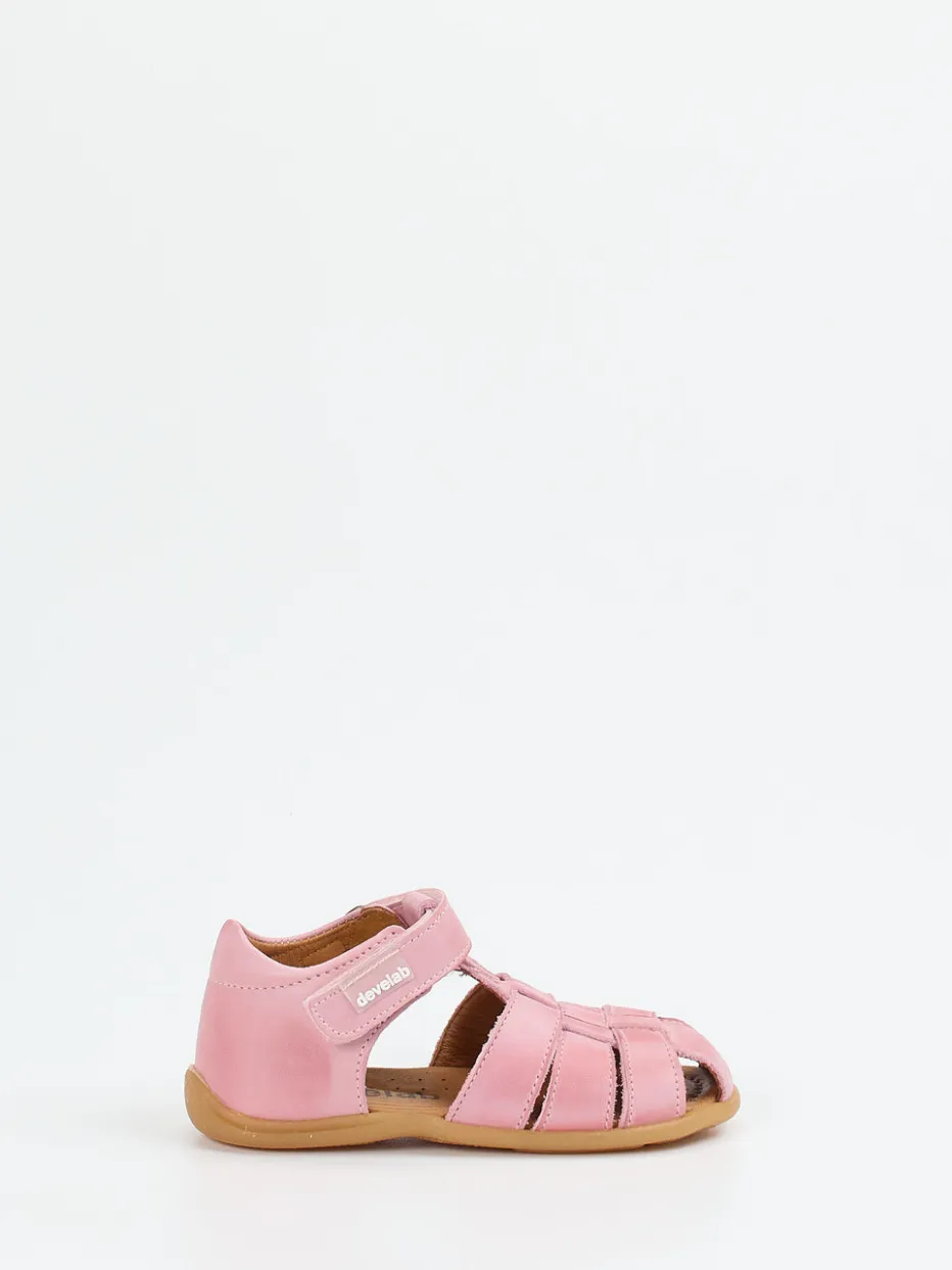 Weich, sicher und stilvoll unterwegs.Die Marke develab präsentiert eine modische Kindersandale im geschlossenen Fischermodell. Für erste Erkundungstouren im Sommer bietet diese Mädchensandale aus samtigem, altrosa Kalbleder sicheren Halt. Die geschlossene Ferse und das anatomisch geformte Lederfußbett sorgen in Kombination mit der weich gepolsterten Innensohle für viel Komfort. Der praktische Klettverschluss ermöglicht ein schnelles An- und Ausziehen und lässt sich passgenau justieren. Die flexible, rutschfeste Gummisohle sowie das reduzierte, skandinavisch inspirierte Design runden das Modell funktional und optisch ab. Sanfte Pastelltöne machen es zum Favoriten in der Sommergarderobe. Ein kindgerechter Sommerschuh mit bewährtem Develab-Komfort.