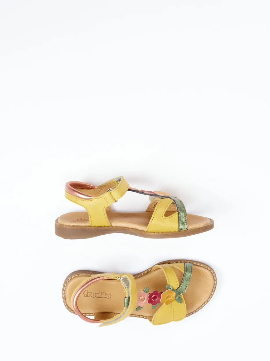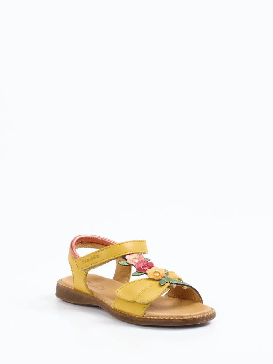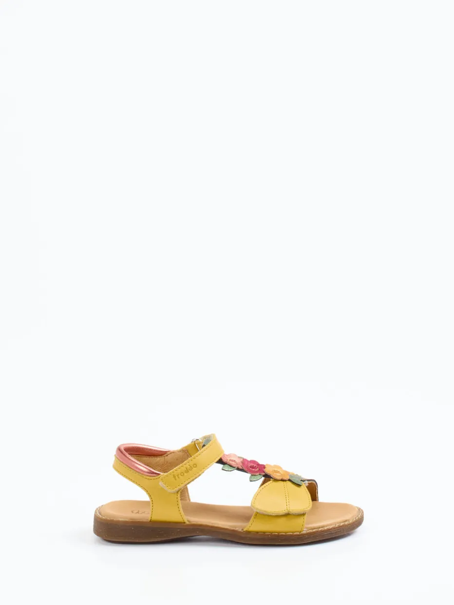Die Marke Froddo präsentiert eine frische Kindersandale aus weichem Kalbleder. Ideal für warme Tage auf dem Spielplatz oder im Urlaub – dank bequemer Polsterung und kinderleichtem Klettverschluss bleibt jeder Schritt entspannt. Die sonnengelbe Farbgebung trifft auf olivgrüne und altrosafarbene Akzente, gebündelt durch einen verspielten T-Riemen. Florale Applikationen und ein glänzender Fersenriemen in Roségold betonen die detailverliebte Gestaltung. Die flexible Gummisohle bietet Trittsicherheit und macht sie zum idealen Begleiter für sommerliche Abenteuer.