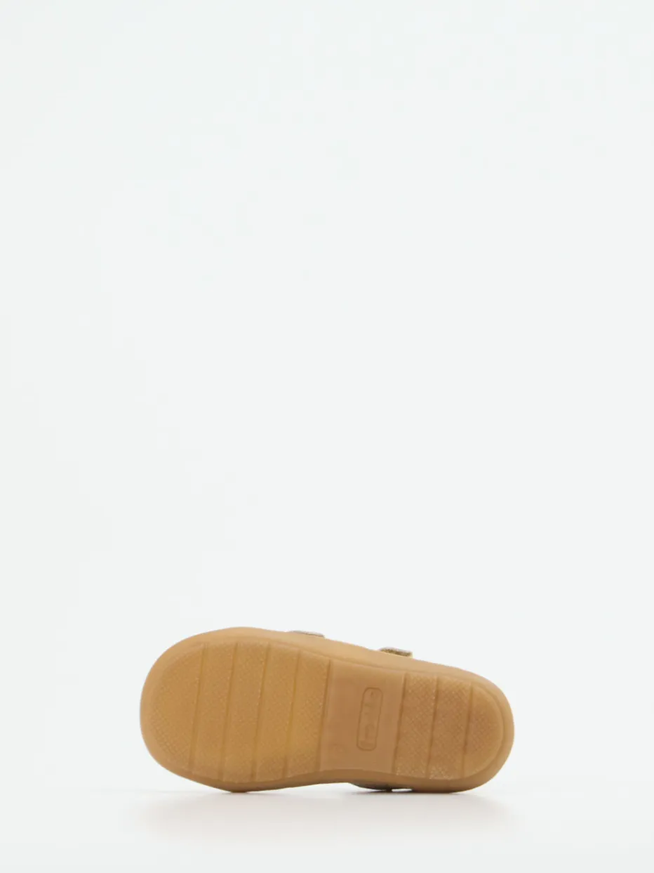 Funkelnd komfortabel in den Sommer.Froddo präsentiert mit dieser Kindersandale ein bequemes Modell mit geschlossener Zehenpartie – perfekt für Alltag und Freizeit. Das geprägte Leder zeigt sich goldfarben und sorgt mit zartem Glitzereffekt auf den Riemchen für ein verspieltes Finish. Zwei Klettverschlüsse ermöglichen eine sichere Passform, während die honigfarbene Gummisohle flexibel und rutschhemmend verarbeitet ist. Die abgerundete Silhouette sowie die vollständig geschlossene Ferse stützen kleine Kinderfüße beim Laufen und Spielen. Floral platzierte Blütenakzente runden den Look kindgerecht ab. Kombiniert mit einer leichten Sommermütze ergibt sich ein stilsicheres Outfit. Froddo steht für hochwertige Materialien und funktionale Designs für Kinderfüße.