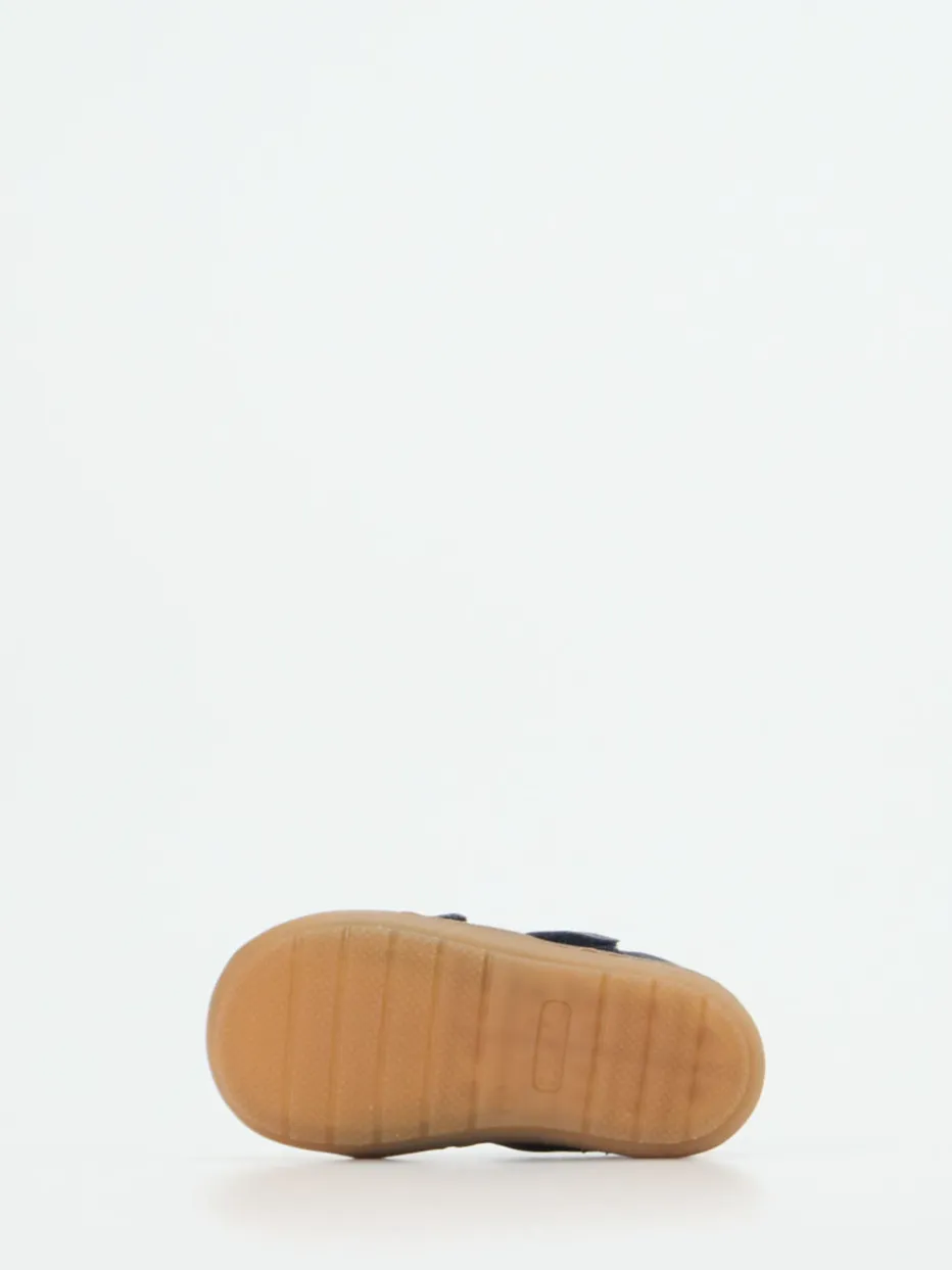 Schützt kleine Füße mit Stil.Die Marke Froddo präsentiert hier funktionale Kindersandalen für Alltag und Freizeit. Ob beim Toben im Garten oder auf sommerlichen Spaziergängen – das robuste, dunkelblaue Kalbleder mit mattierter Oberfläche bietet zuverlässigen Halt und schützt durch die geschlossene Zehenpartie. Zwei praktische Klettverschlüsse ermöglichen ein passgenaues Anziehen, während das Lederfutter und das gepolsterte Fußbett für angenehmen Tragekomfort sorgen. Die honigfarbene Gummisohle ist rutschhemmend und leicht flexibel. Ton-in-Ton-Nähte, eine abgerundete Form sowie das geprägte Markenlogo unterstreichen das minimalistisch-skandinavische Design ideal. Kombinierbar mit Shorts, Kleidern oder leichten Hosen. Ein alltagstauglicher Sommerschuh mit langlebiger Verarbeitung und kindgerechter Funktion.