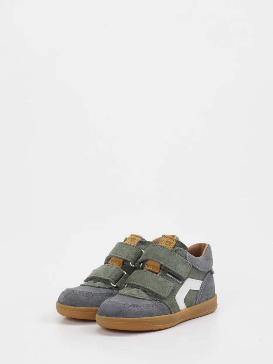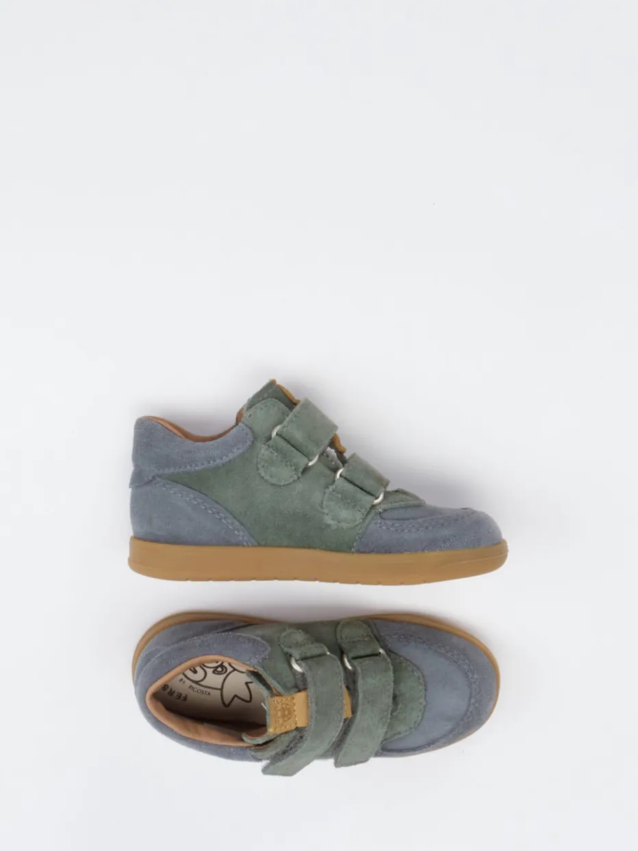 Gefertigt aus weichem Veloursleder mit matter Oberfläche zeigt sich das Modell in Olivgrün mit schiefergrauen und hellbraunen Akzenten. Die klassische Form mit gepolstertem Schaft sorgt für angenehmen Sitz, während der doppelte Klettverschluss das An- und Ausziehen erleichtert. Die rutschhemmende Gummisohle unterstützt sicheres Laufen. Ein weißer Applikationsstreifen an der Seite setzt einen sportiven Akzent im angesagten Retro-Stil.