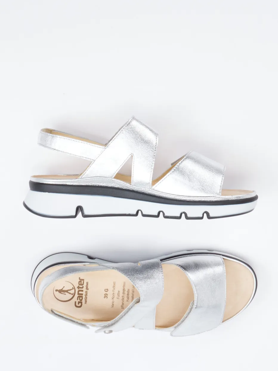 Glanz und Komfort im Sommerlook.Ganter präsentiert mit dieser Damen-Klettsandale ein funktional-ästhetisches Modell für warme Tage. Ideal für Alltag und Urlaub überzeugt die silberfarbene Sandale mit softem Metallicleder, ergonomischem Fußbett und individuell verstellbaren Klettverschlüssen. Die offene Silhouette ist minimalistisch gestaltet, während das glänzende Finish mit schwarz-weißer Kontrastsohle für modische Akzente sorgt. Innenfutter und wechselbares Fußbett sind aus hochwertigem Leder gefertigt und erhöhen den Tragekomfort. Inspiriert vom Trend zu Metallic Accents passt das Modell hervorragend zu Leinenhosen und luftigen Blusen. Die Ganter-typische Kombination aus Komfort, Stil und Passform macht jedes Sommeroutfit citytauglich.