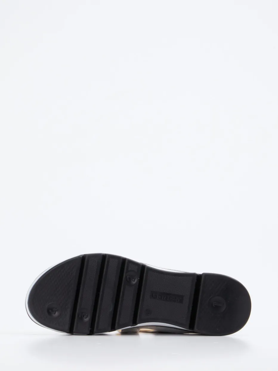 Diese ergonomisch geformte Sandale kombiniert glänzendes Metallicleder mit funktionalem Komfort für sommerlich-entspannte Auftritte.