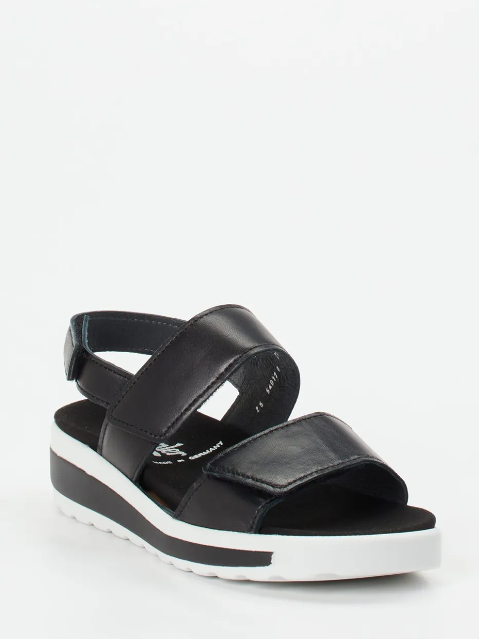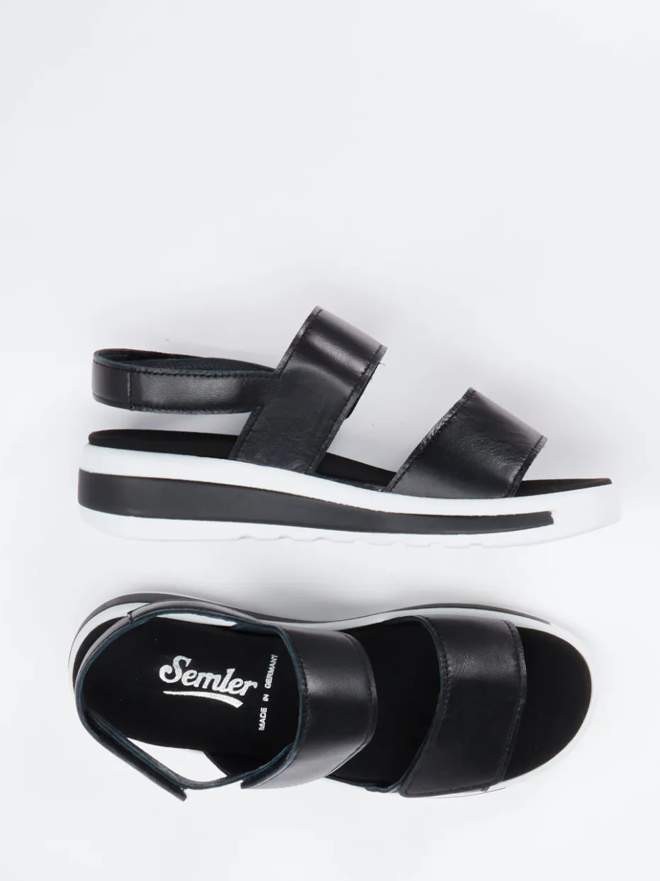 Schlichte Eleganz trifft auf sommerlichen Komfort.Semler präsentiert eine hochwertige Klettsandalette für Damen, gefertigt aus feinem Kalbleder in tiefem Schwarz. Ideal für Shoppingtouren, Reisen oder entspannte Tage: Das weich verarbeitete Obermaterial aus Kalbleder erhält durch die matte Oberfläche und das Unidesign einen eleganten, zurückhaltenden Look. Verstellbare Klettverschlüsse sowie ein sanft gepolstertes, herausnehmbares Fußbett sorgen für volle Anpassbarkeit und Komfort – selbst bei Weite H. Die schwarz-weiße PU-Sohle mit Profilierung unterstützt sicheren Tritt und passt sich minimalistisch jedem Outfit an. Ein klares Must-have im „Comfort Core“-Trend. Semler steht für gehobenes Gehvergnügen mit stilvollem Understatement.