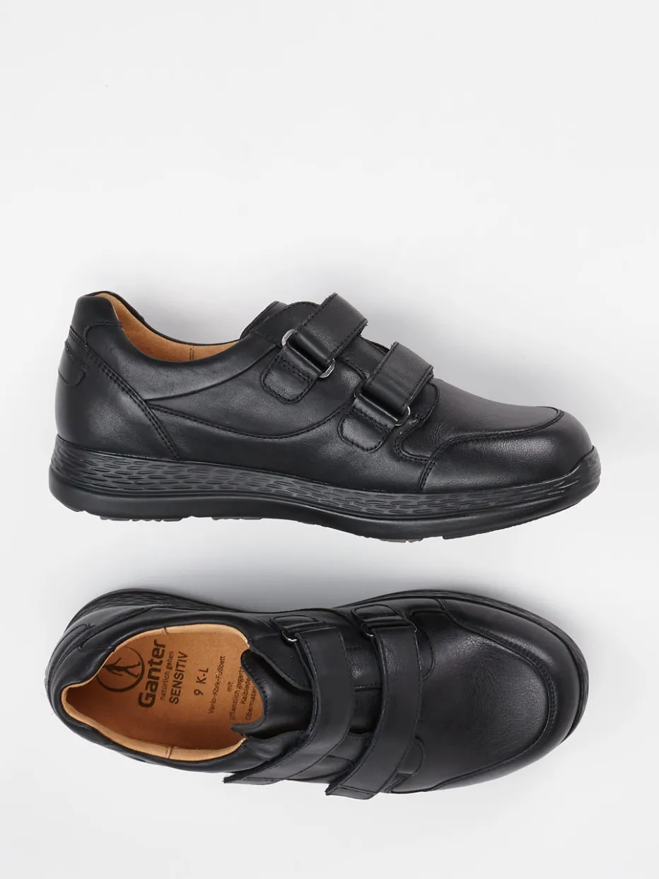 Komfort für jeden Schritt.Ganter präsentiert mit diesem Herren-Klettschuh ein komfortorientiertes Modell für Alltag und Freizeit. Der in klassischem Schwarz gehaltene Halbschuh überzeugt durch softes Kalbleder mit matter Oberfläche und Ton-in-Ton-Nähten. Zwei breite Klettverschlüsse sorgen für optimalen Halt und erleichtern das An- und Ausziehen. Ein gepolsterter Schaftrand sowie das lederbezogene Korkfußbett bieten besonderen Tragekomfort – auch für sensible Füße. Die profilierte Gummisohle gewährleistet Trittsicherheit auf verschiedenen Untergründen. Stilistisch steht das Modell für puristischen Minimalismus mit funktionalem Anspruch. Ganter verbindet Komfort mit orthopädischer Expertise – spürbar bei jedem Schritt.
