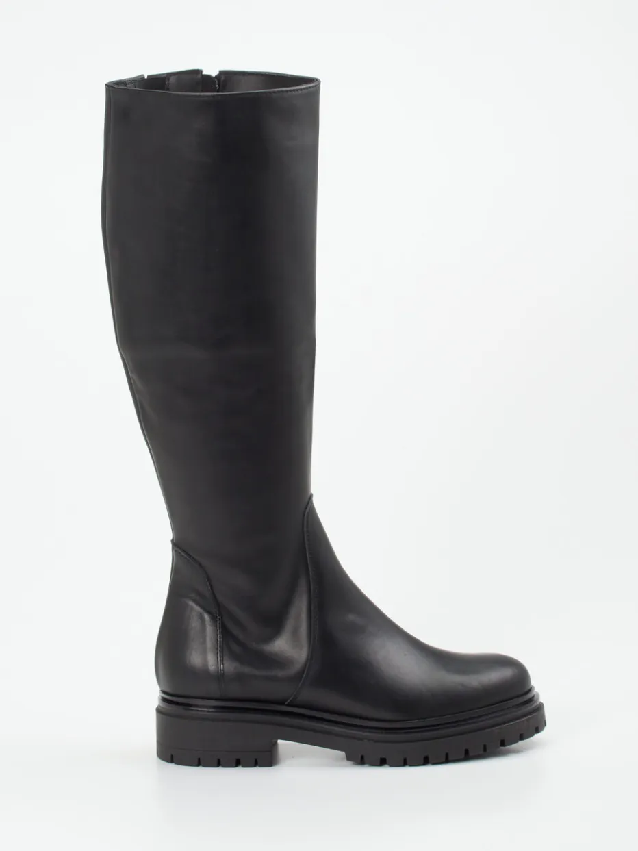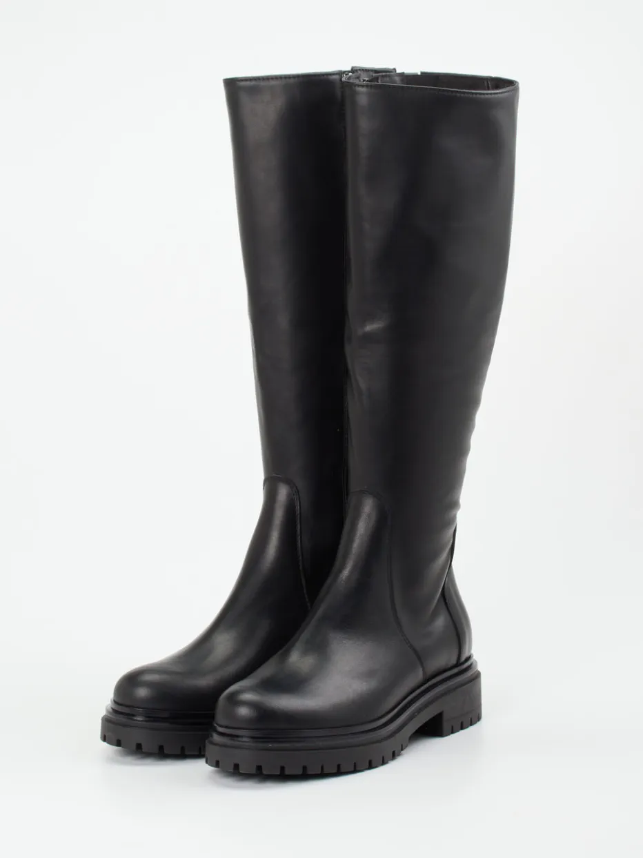 Gefertigt aus geschmeidigem Kalbleder und ausgestattet mit einer robusten Profilsohle, verbinden diese kniehohen Stiefel reduziertes Design mit urbaner Funktionalität.