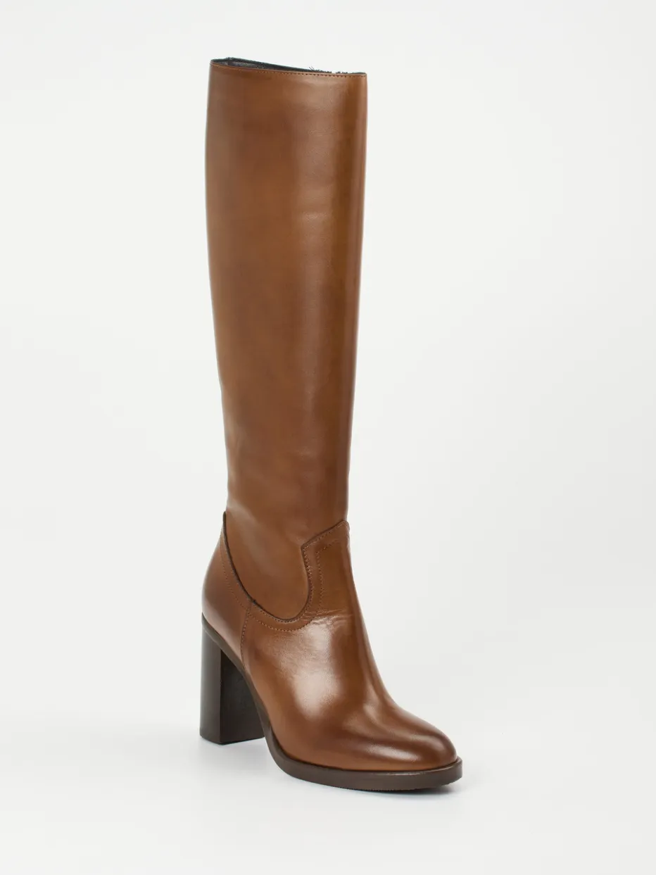Das cognacbraune Glattleder verleiht dem kniehohen Stiefel eine anspruchsvolle Eleganz. Der moderne Blockabsatz rundet das Design mit einem funktionalen Stilverständnis ab.