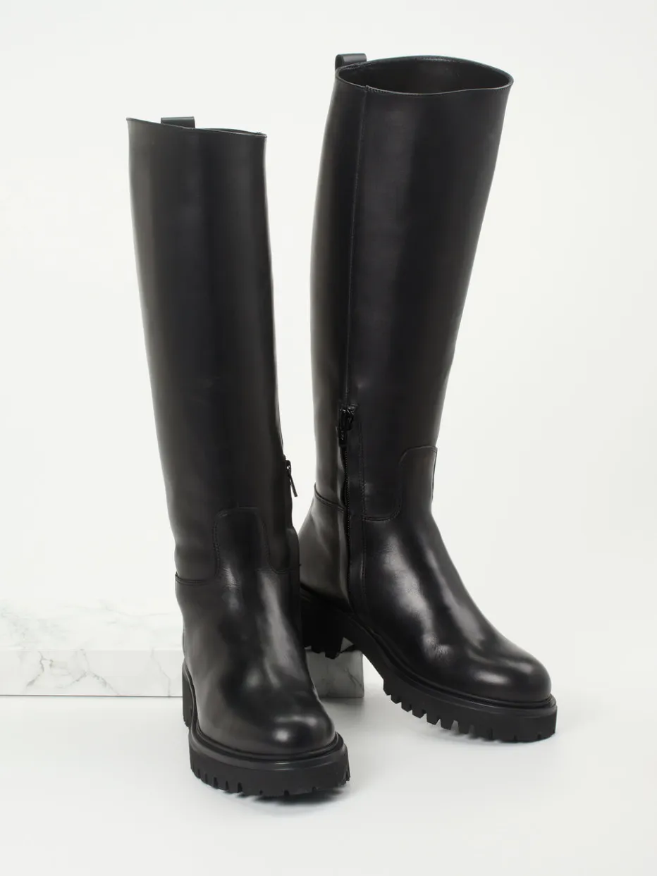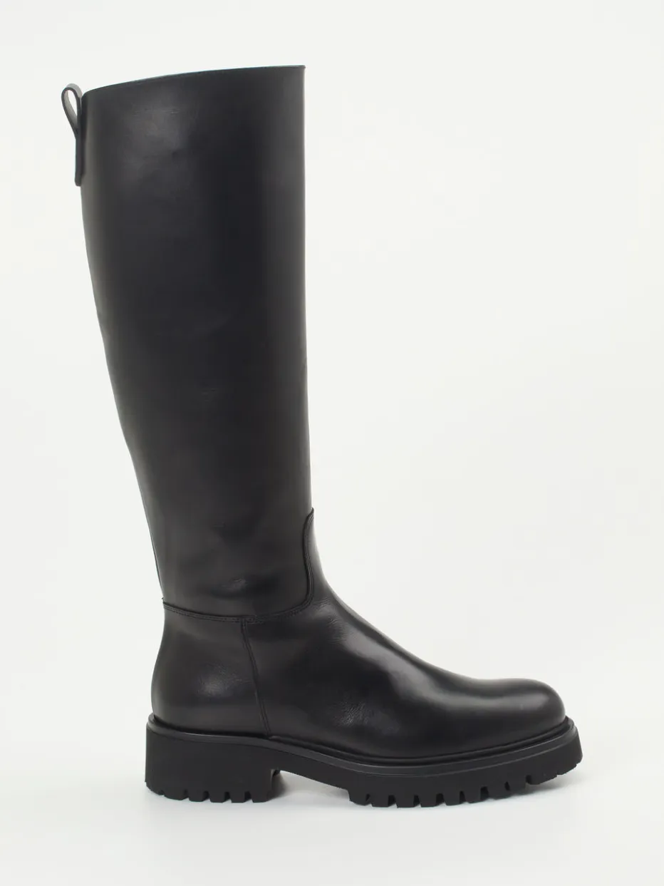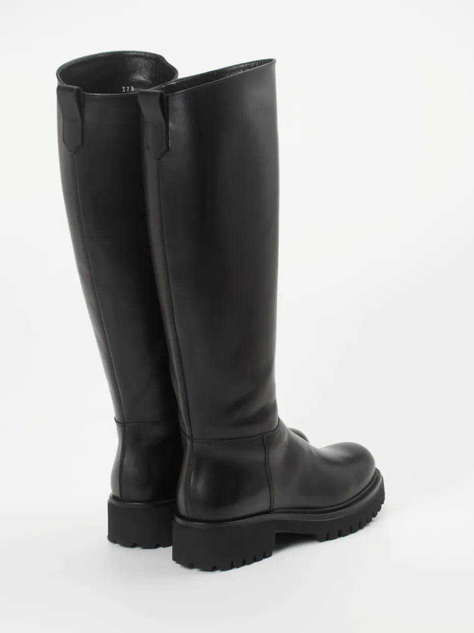 Der kniehohe Stiefel von Konstantin Starke kombiniert hochwertiges Kalbleder mit klarem Design und funktionaler Profilsohle für urbanen Chic bei jedem Wetter.