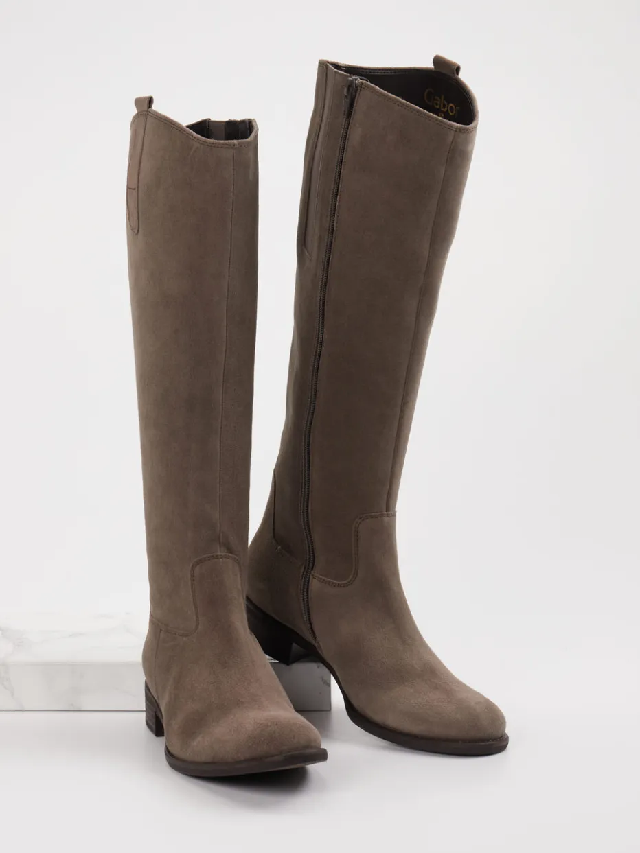 Schlichte Raffinesse für den Herbst. Gabor präsentiert diese eleganten Damen-Kniestiefel in edlem Veloursleder. Mit ihrem tonalen Taupefarbton, der matten Oberfläche und der geradlinigen Silhouette passen die Stiefel ideal in minimalistische Herbst-Looks. Ein Reißverschluss sorgt für bequemes An- und Ausziehen, während Gummisohle und flacher Blockabsatz für Alltagskomfort stehen. Die dezente Zuglasche und das unaufdringliche Branding unterstreichen die stilvolle Zurückhaltung. Perfekt kombinierbar zu monochromen Outfits oder soften Neutraltönen. Ein zeitloser Begleiter mit femininer Formensprache und hochwertiger Materialsprache von Gabor.