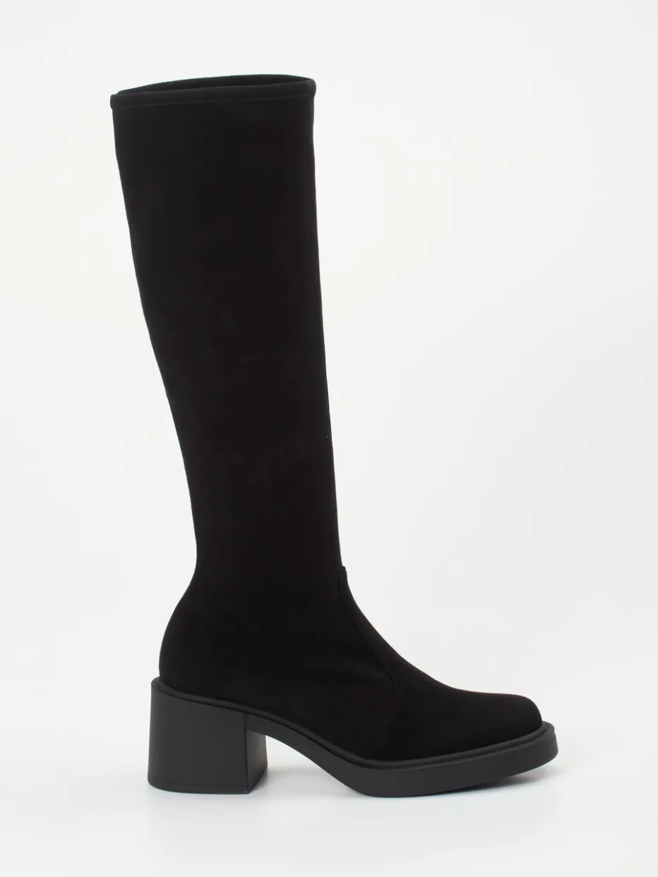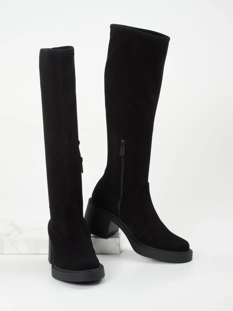 Der elegante Kniestiefel von Konstantin Starke überzeugt durch minimalistisches Design, samtiges Veloursleder und einen komfortablen Blockabsatz – ideal für stilvolle Herbst-Looks.