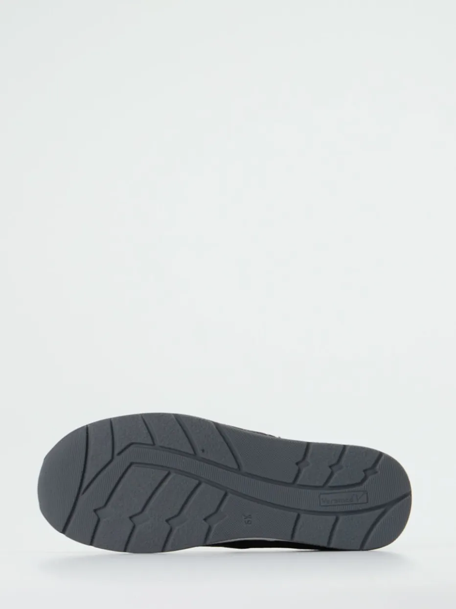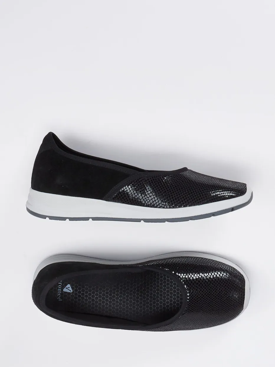 Flexibilität trifft moderne Eleganz.Varomed präsentiert mit diesem Komfort-Ballerina ein Modell, das Alltagstauglichkeit mit dezenter Raffinesse vereint. Ideal für lange Tage auf den Beinen: Das weiche Stretchmaterial passt sich sensiblen Füßen individuell an und wird im Fersenbereich durch samtig angeschliffenes Veloursleder ergänzt. Die schwarz-graue Farbkombination unterstreicht den ruhigen Look, während die glänzende Reptilprägung am Vorderfuß einen stilvollen Akzent setzt. Die profilierte Gummisohle bietet sicheren Halt, das gepolsterte Fußbett erhöht den Tragekomfort zusätzlich. Schlupfform und flache, gerundete Silhouette unterstreichen das minimalistische Design mit Quiet-Luxury-Attitüde. Kombiniert mit schlichten Basics entsteht ein angenehmes, urbanes Outfit. Varomed steht für durchdachte Funktionalität mit gesundheitsschonendem Komfort.
