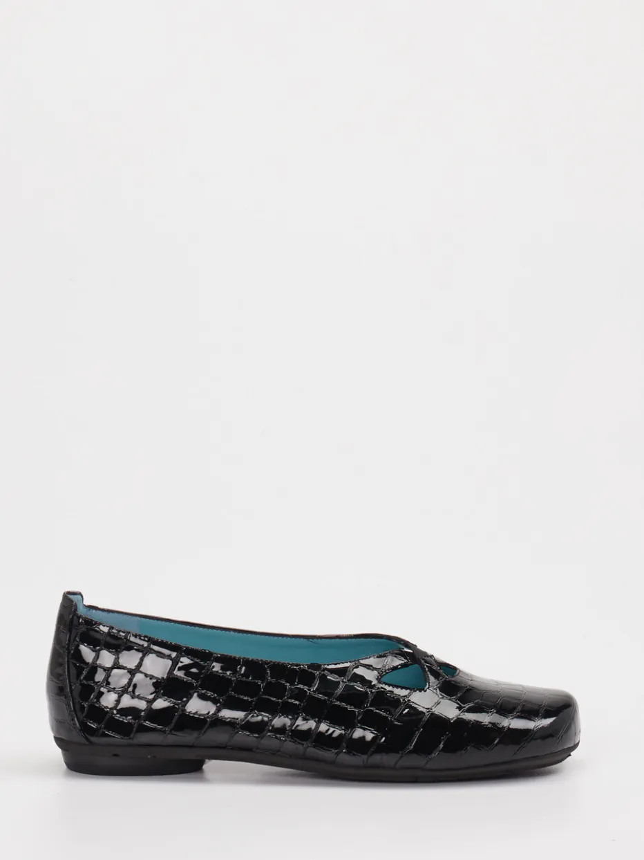 Eleganz mit Struktur. Thierry Rabotin präsentiert Komfort-Ballerinas für Damen mit hochwertigem Kalbleder und prägnanter Krokoprägung. Für Büroalltag oder City-Flair bieten die flachen Schuhe mit glänzender Oberfläche, dekorativem Cutout und schwarzer Gummisohle stilvolle Leichtigkeit. Der elastische Einstieg und das weiche Lammnappa-Futter in Türkis sorgen für ein angenehmes Tragegefühl, unterstützt durch ein bequemes Fußbett und eine rutschhemmende Profilsohle. Die klassische Form mit leicht eckiger Zehenpartie greift Retro-Flair der 90er auf – passend zu aktuellen Trends wie Quiet Luxury und modernen Retro-Flats. Pflegeleicht und vielseitig – die Kombination aus Handwerkskunst und zeitloser Ästhetik überzeugt im Alltag.