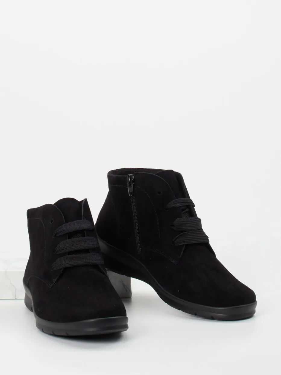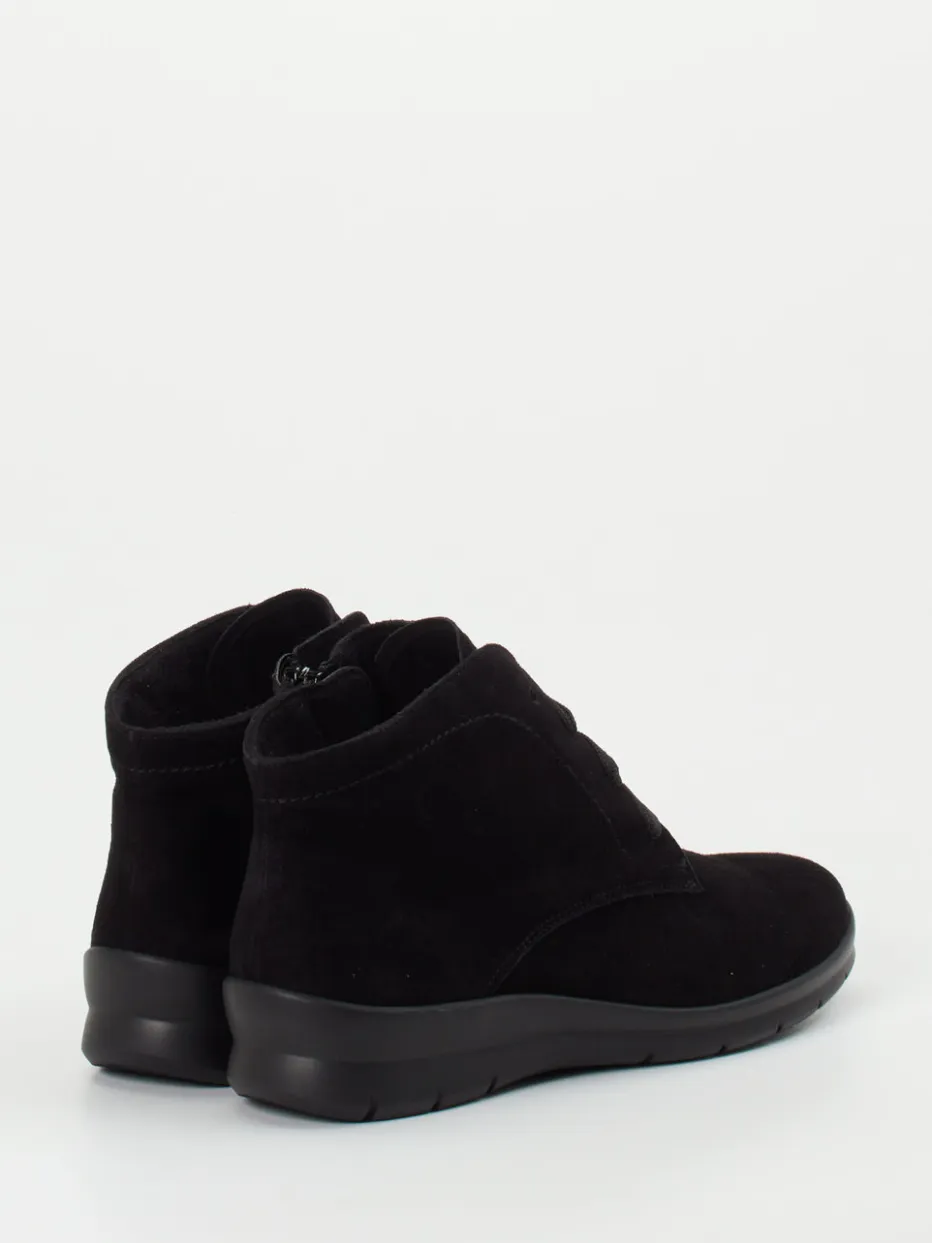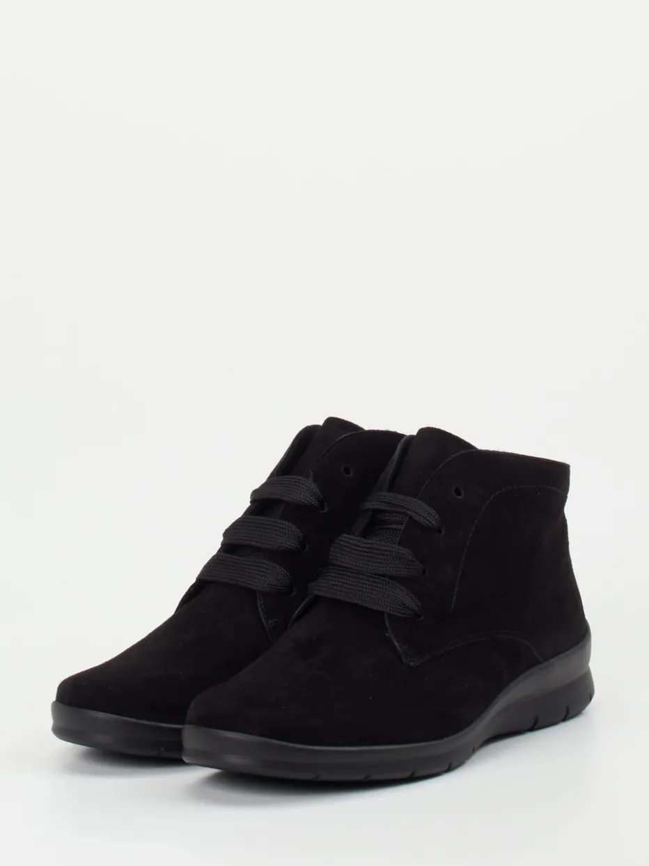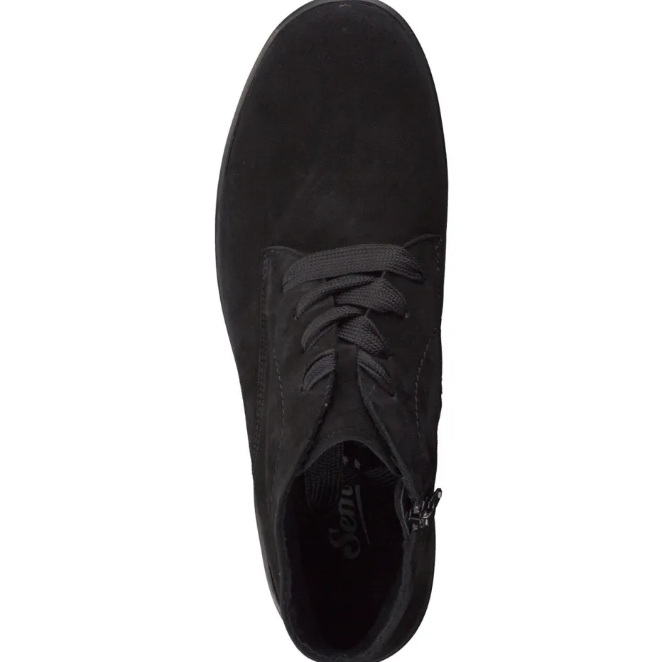 Komfort in klarer Silhouette.Semler präsentiert mit diesen Damen-Stiefeletten ein Modell aus der Kategorie Komfort-Boots. Wenn Bequemlichkeit bei ausgedehnten Spaziergängen oder langen Arbeitstagen gefragt ist, überzeugt dieser knöchelhohe Schnürschuh mit weich verarbeitetem Veloursleder in Tiefschwarz und matt strukturierter Oberfläche. Breite Schnürsenkel und ein seitlicher Reißverschluss ermöglichen einfaches An- und Ausziehen. Eine profilierte PU-Sohle mit Luftpolsterung bietet rutschfesten Halt und ein angenehmes Laufgefühl. Wechselfußbett und komfortable Weite H garantieren zusätzlichen Tragekomfort. Die puristische Linienführung passt bestens zu aktuellen „Quiet Luxury“-Looks. Markentypische Alltagstauglichkeit mit hochwertigem Tragegefühl.
