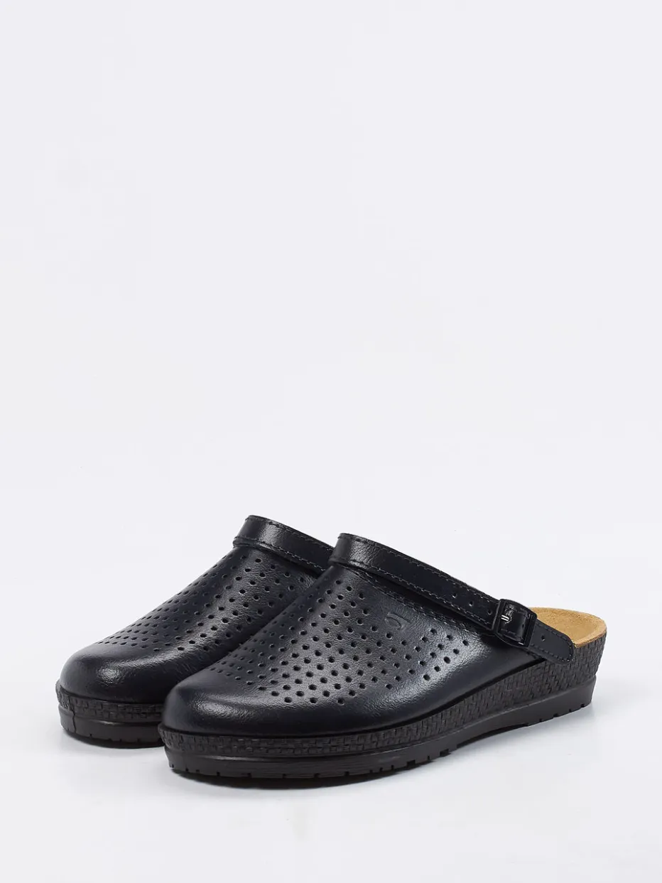 Perfekt für Zuhause oder die Freizeit, überzeugt das Modell durch hochwertiges Kalbleder mit matter Oberfläche und dezenter Perforierung. Der verstellbare Fersenriemen samt Metallschnalle ermöglicht individuelle Anpassung. Ergonomisches Fußbett und eine profilierte PU-Sohle sorgen für Bequemlichkeit bei jedem Schritt. Der Clog präsentiert sich in einem dunklen Blauton mit Ton-in-Ton-Nähten und geschlossener, ergonomischer Form – inspiriert vom Quiet-Luxury-Trend.