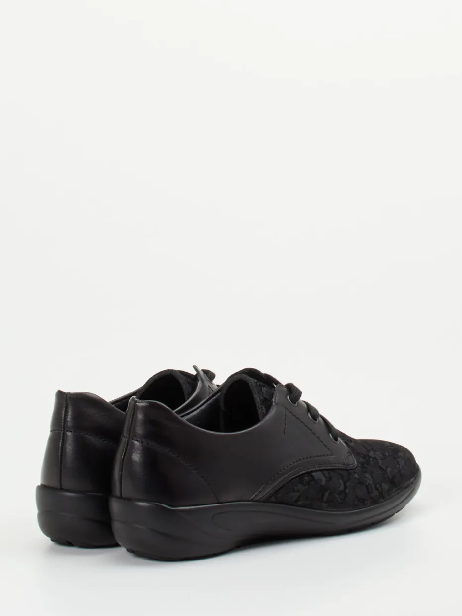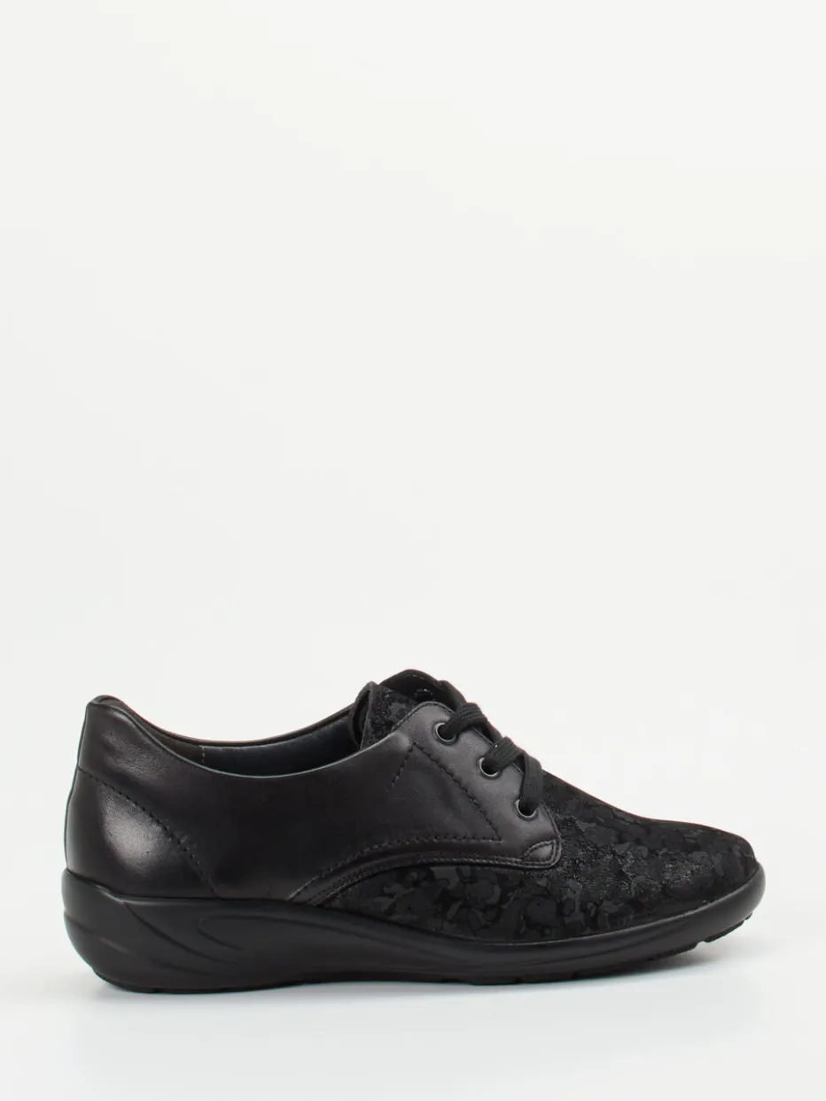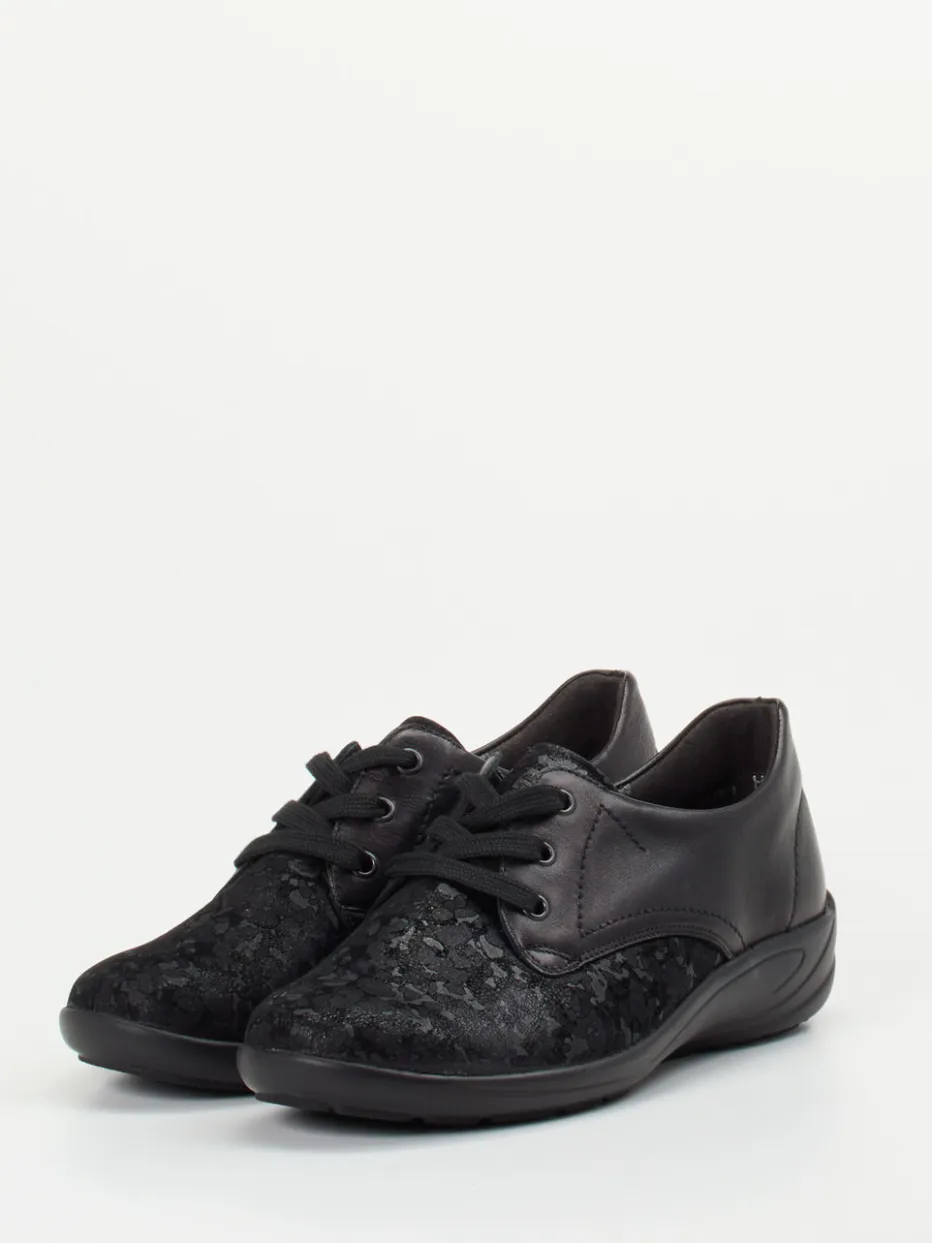 Schwarzer Komfort trifft florales Design.Die Marke Semler präsentiert einen hochwertigen Komfort-Halbschuh für Damen. Ideal für entspannte Spaziergänge oder lange Tage auf den Beinen: Der Schnürschuh verbindet weiches Kalbleder mit strukturiertem Stretchmaterial in floraler Prägung. Das schwarze Design in matter Ton-in-Ton-Optik steht für unaufdringliche Eleganz. Eine ergonomische PU-Komfortlaufsohle, die herausnehmbare Innensohle und Polsterungen erhöhen den Tragekomfort deutlich und bieten Raum für orthopädische Einlegesohlen. Die runde Form und dezente Details fügen sich harmonisch ins Gesamtbild ein. Perfekt kombinierbar zu einer schwarzen Komforthose oder smarten Casual-Looks. Semler Qualität für komfortbetontes Gehen mit stilvollem Understatement.