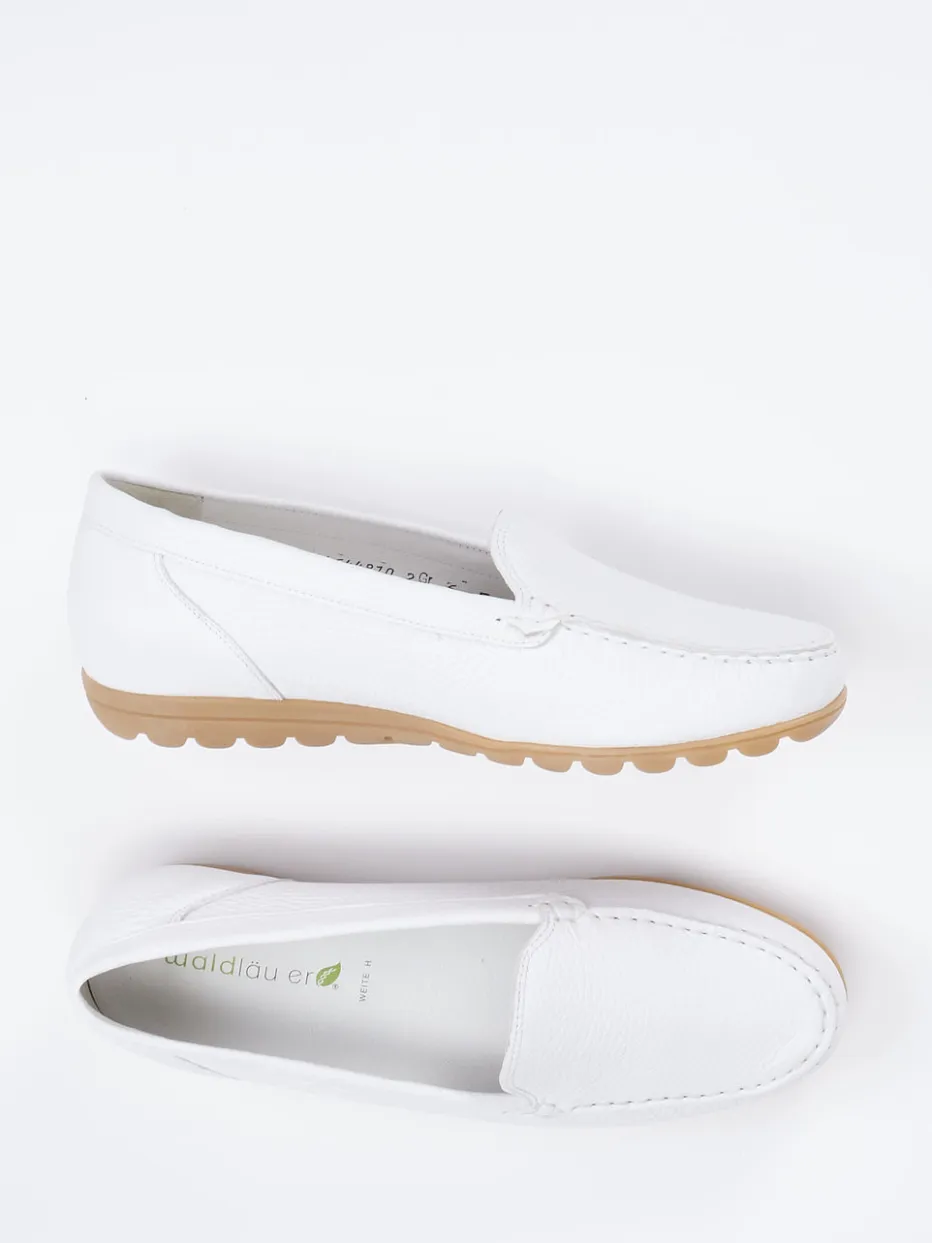Sommer-Komfort mit eleganter Zurückhaltung.Waldläufer präsentiert einen Damen-Komfort-Loafer aus der Bequem-Linie. Gefertigt aus strahlend weißem Hirschleder mit natürlicher Narbung und genarbter Oberfläche, spricht das Modell das Bedürfnis nach Leichtigkeit und Alltagstauglichkeit an. Die schlupffreundliche Silhouette mit klassischem Schnitt wird von einer naturfarbenen Gummisohle mit rutschhemmendem Profil ergänzt. Innen überzeugt der Schuh mit gepolstertem Lederfußbett, das sich durch Einlagen austauschen lässt. Ton-in-Ton-Nähte und eine Mokassinnaht auf dem Blatt setzen dezente Akzente im Zeichen stillen Luxus. Minimalistisches Design trifft auf höchsten Tragekomfort. Waldläufer steht für wohldurchdachten Komfort in zeitloser Optik.