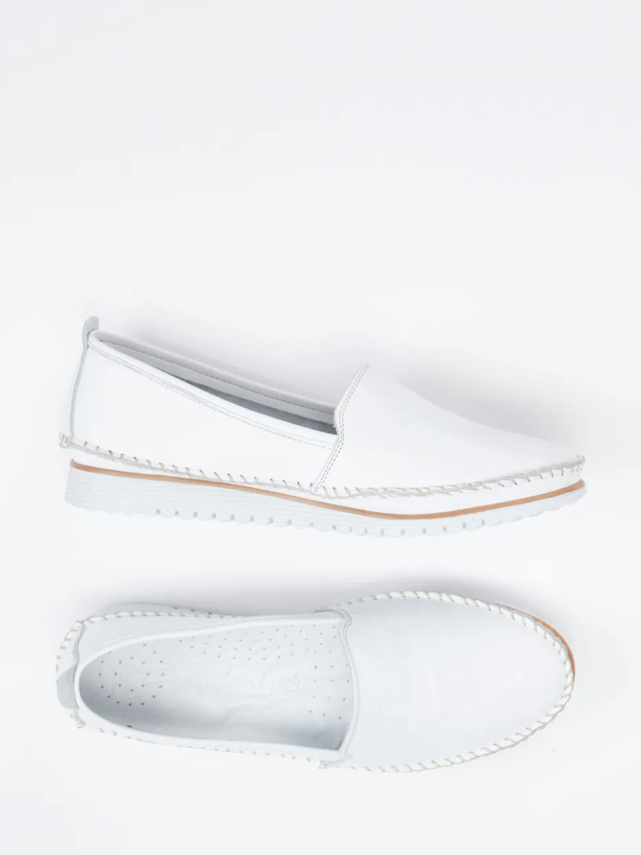 Leichtigkeit entdecken.Andrea Conti zeigt mit diesem Komfort-Loafer für Damen einen sehr bequemen Slipper mit klarer Formsprache. Ideal für warme Tage im Büro oder entspannte Nachmittage im Café: Das Modell aus weißem Kalbleder mit matter Oberfläche überzeugt durch sein weich gepolstertes Fußbett und flexiblen Gummisohle in Beige-Weiß. Eine hellgraue Kontrastnaht unterstreicht die handwerkliche Verarbeitung entlang der flachen, rund zulaufenden Silhouette. Der elastische Einstieg erleichtert das Hineinschlüpfen, die profilierte Sohle bietet sichere Bodenhaftung. Inspiriert vom „Quiet Luxury“-Trend, passt der Look perfekt zur Casualwear. Dezenter Komfort mit authentischem Anspruch – typisch Andrea Conti.