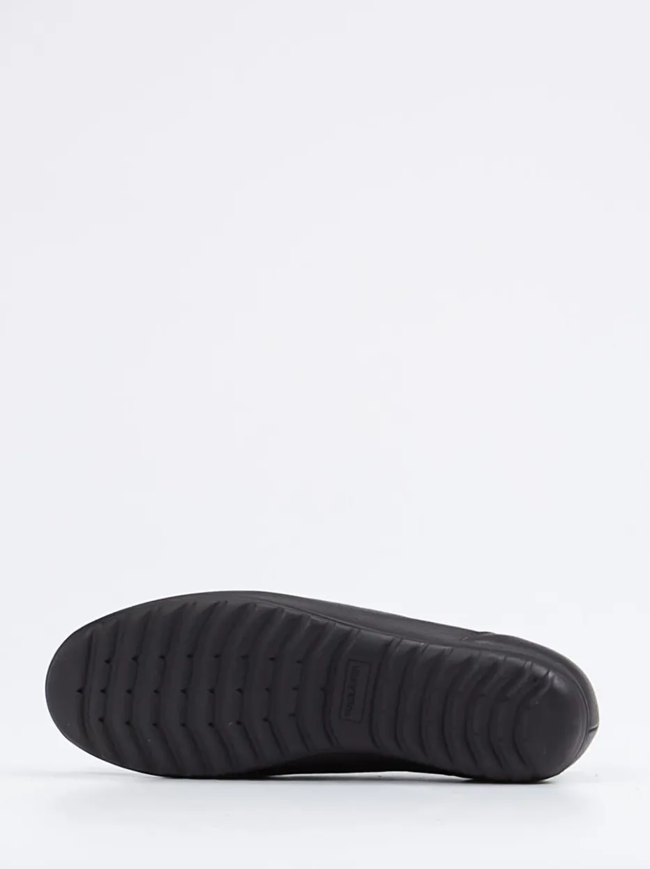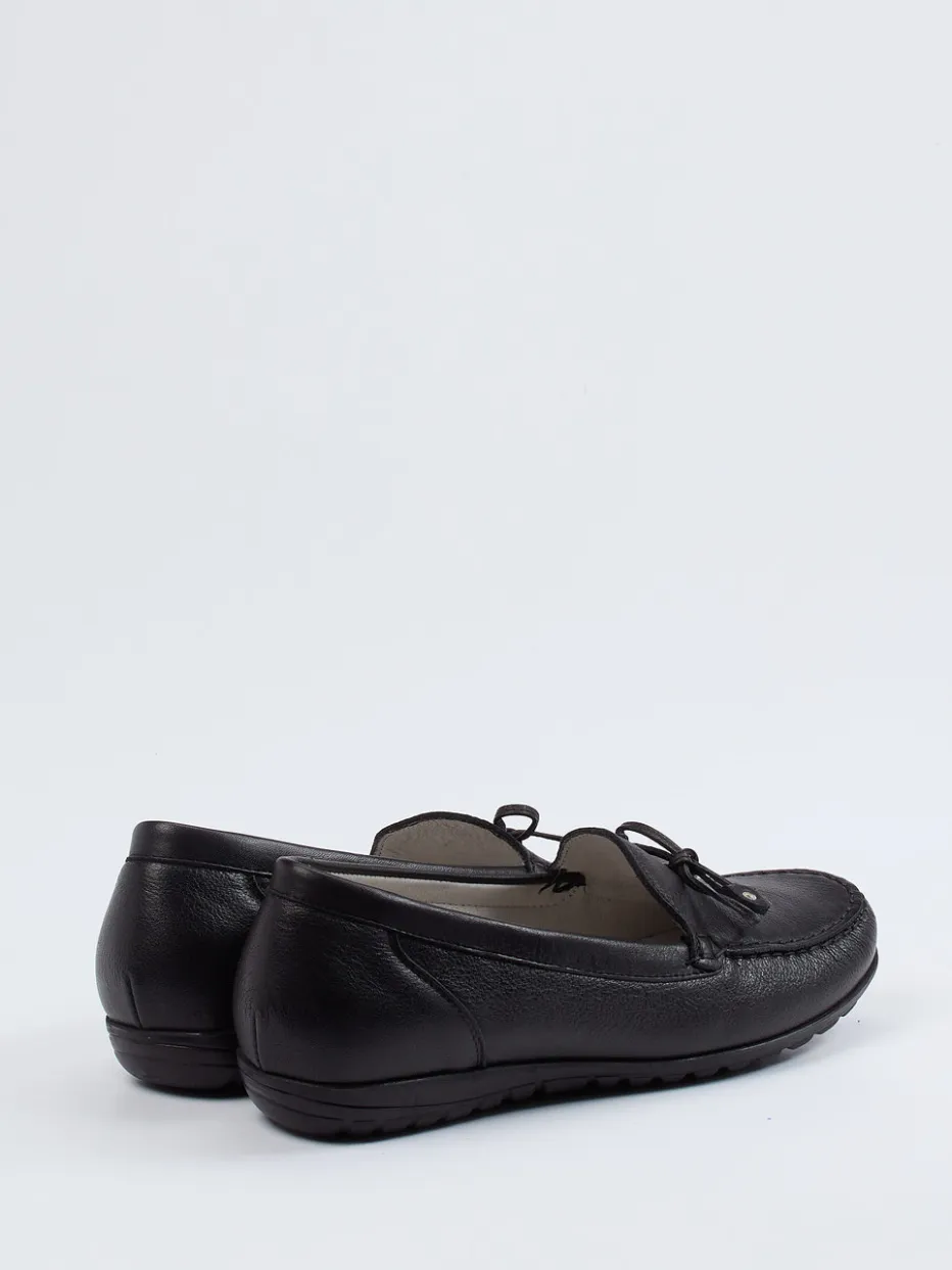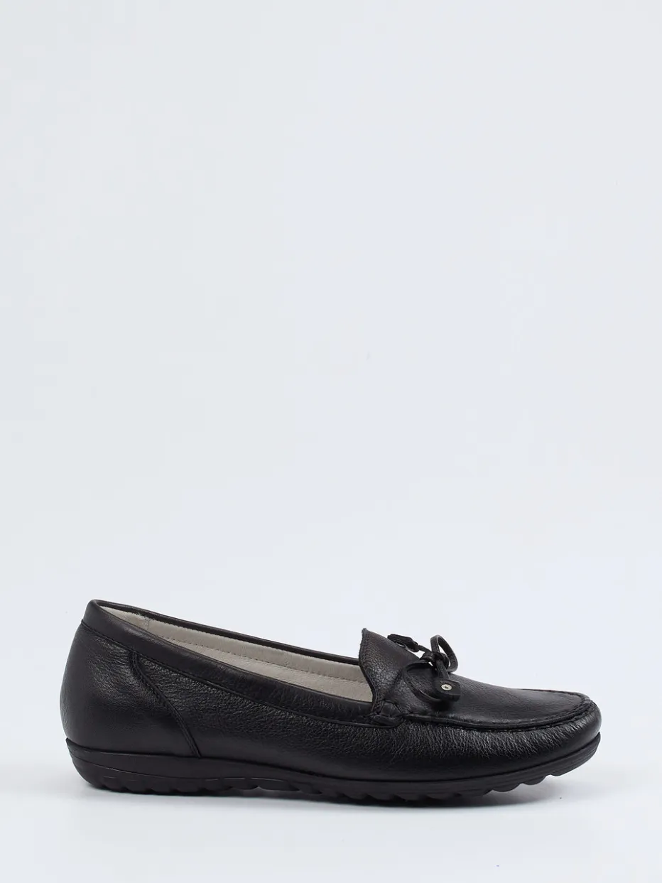 Komfort auf ganzer Linie.Waldläufer präsentiert einen eleganten Damen-Komfort-Loafer aus der Linie Hesina. Ob im Büro oder beim Stadtbummel – dieser Slipper überzeugt mit genarbtem Kalbleder in zeitlosem Schwarz, weichem Lederfutter und bequemem H-Leisten-Schnitt. Die klassisch flache Silhouette wird durch eine feine Zierschleife und eine Mokassinnaht akzentuiert. Eine profilierte Gummisohle sorgt für Trittsicherheit, während das herausnehmbare Fußbett individuelle Einlagen ermöglicht. Inspiriert vom Soft Loafer Trend vereint das Modell zurückhaltenden Stil und maximalen Komfort. Durchdachter Minimalismus mit Wohlfühlfaktor – typisch Waldläufer.