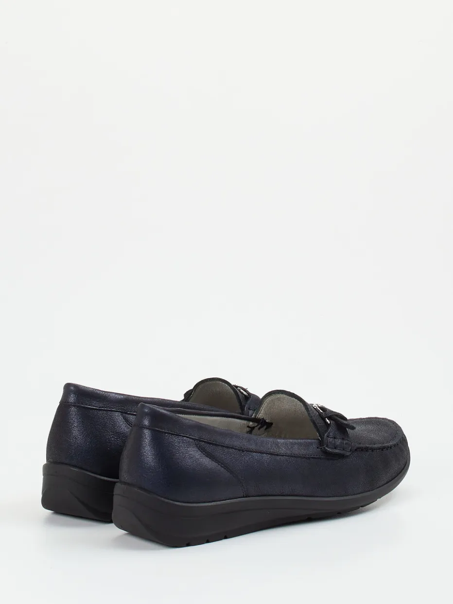 Eleganz trifft Bequemlichkeit.Waldläufer präsentiert einen Komfort-Loafer für Damen, der zeitlose Ästhetik mit praktischer Alltagstauglichkeit vereint. Ideal für Büro oder Freizeit bietet dieser Slipper aus dunkelblauem Metallicleder mit leicht glänzender Oberfläche zuverlässigen Komfort. Die klassische, flache Silhouette mit Mokassinnaht und silberfarbener Schnalle verleiht dem Modell eine dezente Eleganz. Seine ergonomische Gummisohle mit angedeutetem Keil sorgt für Trittsicherheit, während das auswechselbare Lederfußbett auch individuelle Einlagen ermöglicht. Filigrane Ton-in-Ton-Nähte unterstreichen den puristischen Look. Optimal kombinierbar mit Stretchhosen oder schlichten Röcken. Ein Loafer mit durchdachtem Komfort und zurückhaltendem Stil – ganz im Zeichen von Quiet Luxury.