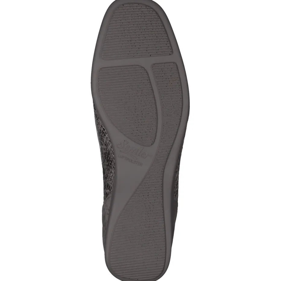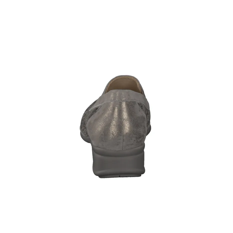 Schimmernder Komfort im Business-Alltag.Der Komfortslipper von Semler vereint elegante Optik mit durchdachtem Tragekomfort. Ideal für lange Tage im Büro oder aktive Stunden im Alltag: Dieser Damen-Loafer überzeugt durch silbergraues Metallicleder mit glänzender Reptilprägung und elastische Einsätze für bequemes Hineinschlüpfen. Die gepolsterte Luftpolstersohle mit leichtem Keilabsatz sorgt für Stabilität, während das herausnehmbare Vario-Fußbett auch orthopädische Einlagen erlaubt. Die tonige PU-Sohle ist rutschhemmend profiliert und unterstreicht den komfortbetonten Charakter dieses Modells. Die klassische Form passt hervorragend zu schmalen Stoffhosen oder minimalistischen Outfits. Semler steht für alltagstaugliche Eleganz – funktional veredelt.
