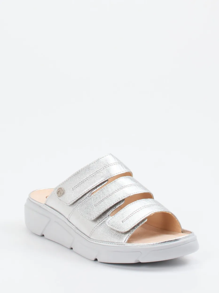 Silber trifft Komfort in jeder Bewegung.Die Marke Ganter präsentiert eine Damen-Komfort-Pantolette, die Alltagstauglichkeit und modische Akzente gekonnt vereint. Dank drei praktischer Klettverschlüsse lässt sich die ergonomische Form individuell anpassen – ideal für lange Tage zuhause oder unterwegs. Gefertigt aus hochwertigem, silberfarbenem Metallicleder mit vegetabil gegerbter Innensohle besticht das Modell durch eine glänzende Oberfläche und dezentes Marken-Branding. Die gepolsterte Lederabdeckung des Korkfußbetts bietet gesunden Halt und kann bei Bedarf gegen eigene Einlagen ausgetauscht werden. Rutschhemmende Gummisohle und stoßdämpfende 4-Punkte-Struktur runden das funktionale Design ab. Besonders harmonisch kombinierbar mit Leinenlooks oder fließenden Sommerstoffen. Ganter steht für wohldurchdachte Fußfreiheit mit Anspruch an Design und Qualität.
