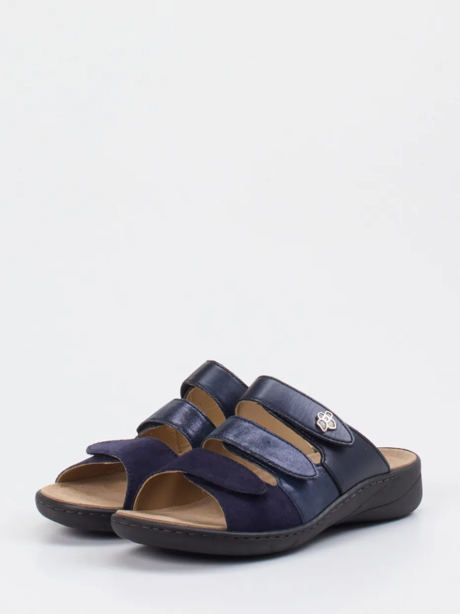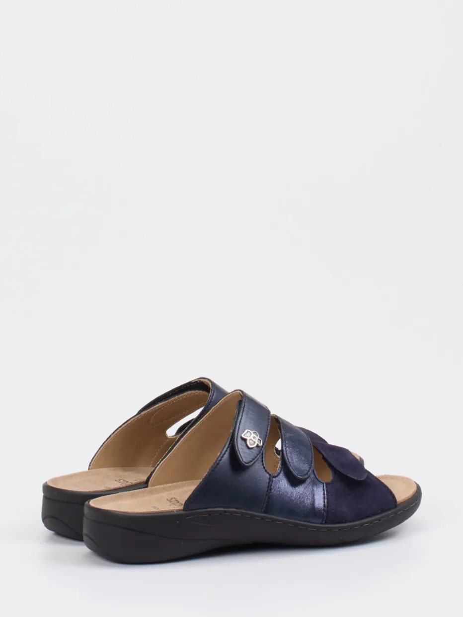 Solidus präsentiert eine Damen-Komfort-Pantolette, die Alltagstauglichkeit und dezente Eleganz vereint. Für entspannte Spaziergänge oder gemütliche Stunden in den eigenen vier Wänden bietet das Modell optimalen Halt und Komfort. Ein ergonomisch geformtes Fußbett sowie eine weiche PU-Sohle unterstützen gezielt. Das Metallicleder erscheint in einem tiefen Dunkelblau mit changierend matten und glänzenden Partien. Drei Klettverschlüsse ermöglichen eine individuelle Passform. Silberfarbene Zierschnallen und sichtbare Nähte akzentuieren den klaren Look. Das Design nimmt Anleihen beim aktuellen Functional-Footwear-Trend und überzeugt mit minimalistischem Stil. Ein stilvoller Komfortschuh aus dem Hause Solidus für anspruchsvolle Ruhepole im Alltag.