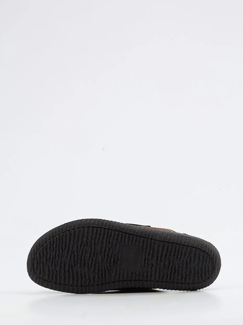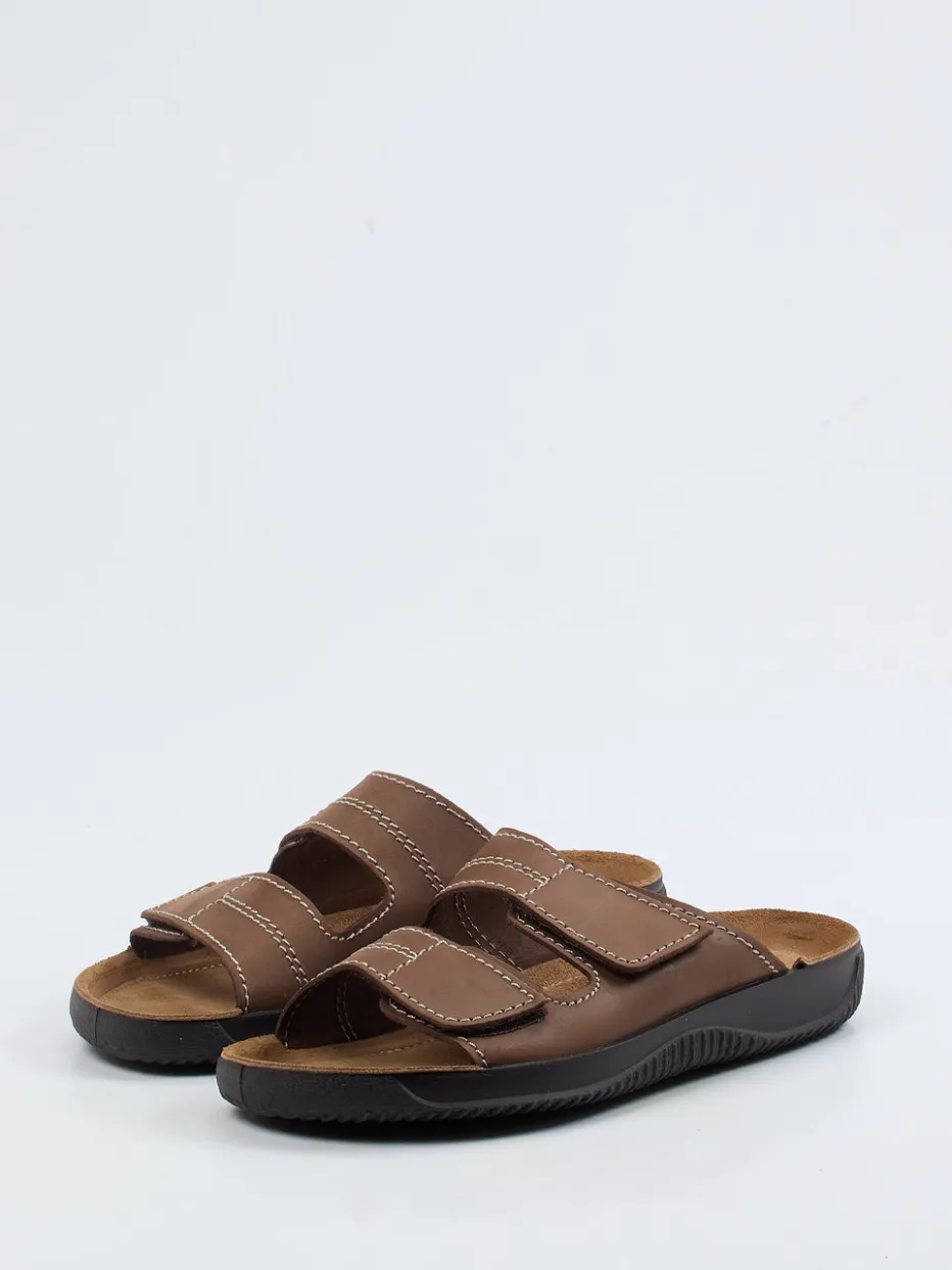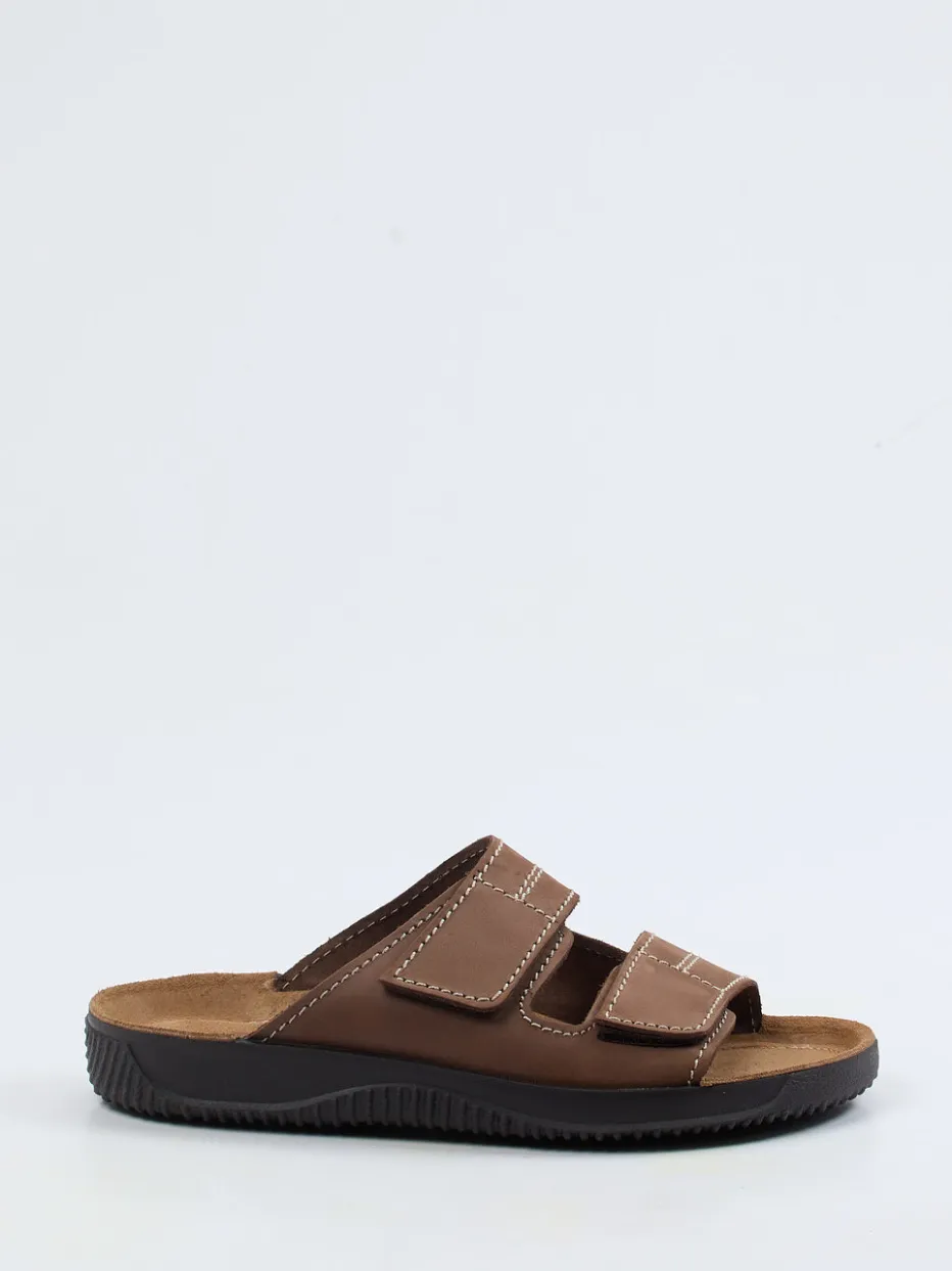 Das braune Nubukleder zeigt sich samtig angeschliffen und unterstreicht den lässig-matten Look. Zwei breite Klettverschlüsse und ein ergonomisch gepolstertes, lederbezogenes Fußbett bieten bequemsten Halt. Kontrastnähte und eine offene Form greifen den aktuellen Comfort-Trend auf, während die rutschhemmende Gummisohle sicheren Stand verspricht. Ideal zur Sweatpants oder Shorts tragbar.