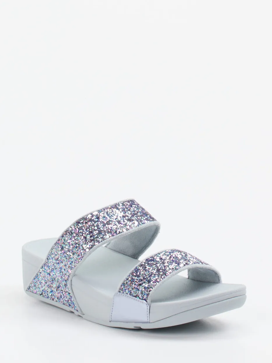 Multicolor-Glitter, glänzende Textilriemen und lavendelfarbene Akzente treffen auf eine weich gepolsterte Innensohle. Die ergonomisch geformte Keilsohle aus Gummi sorgt für ausgewogene Druckverteilung und sicheren Halt bei Alltagstouren oder auf Sommerfesten. Die Schlupfform mit zwei breiten Riemen bietet unkomplizierten Einstieg. Im Y2K-Stil gehalten, setzt dieses Modell aktuelle Metallic- und Glitter-Trends um. Kombiniert mit leichten Kleidern oder schimmernden Accessoires entfaltet sich der volle Look.
