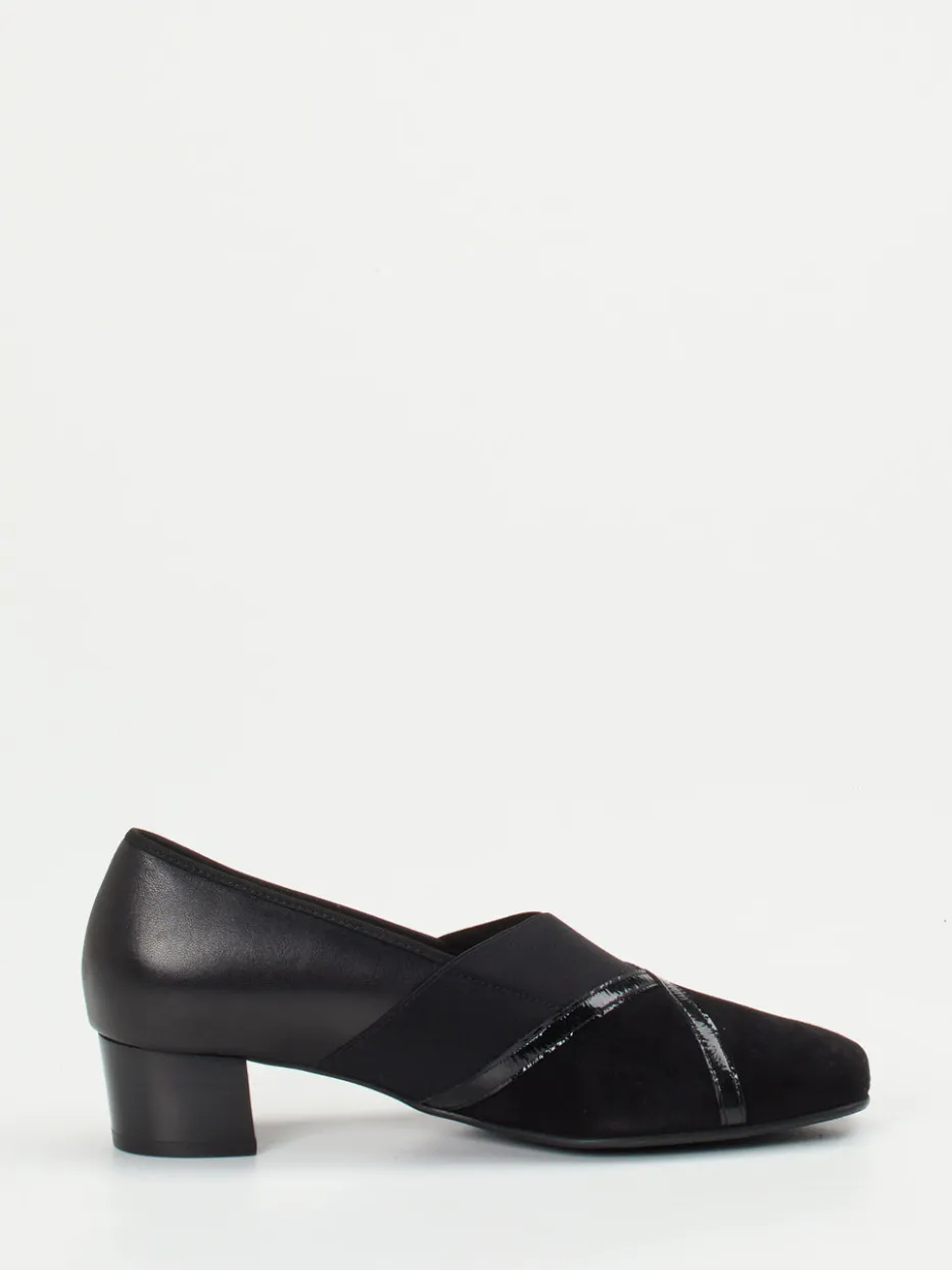 Eleganz trifft bequeme Linienführung.Die Marke Hassia präsentiert einen Komfort-Pumps für anspruchsvolle Damen mit stilvollem Alltag. Für Büro und Freizeit gleichermaßen geeignet, überzeugt das fein abgestimmte Modell durch eine Kombination aus schwarzem Samtziegen-Veloursleder, glattem Kalbleder und dekorativen Lackleder-Details. Die klassische, leicht spitz zulaufende Form mit quadratischer Front wird durch zwei breite Elastikbänder modisch ergänzt und sorgt gemeinsam mit der Komfortweite J für optimalen Halt. Eine halbe Leder-Gummisohle, das herausnehmbare Fußbett und der dezente Blockabsatz runden den funktionalen Komfortanspruch ab. Der Look ist der „Quiet Luxury“-Stilrichtung zugeordnet und wirkt besonders edel in Kombination mit monochromen Office-Outfits. Ein bequemer City-Pumps, der Ästhetik mit Komfortexzellenz vereint.