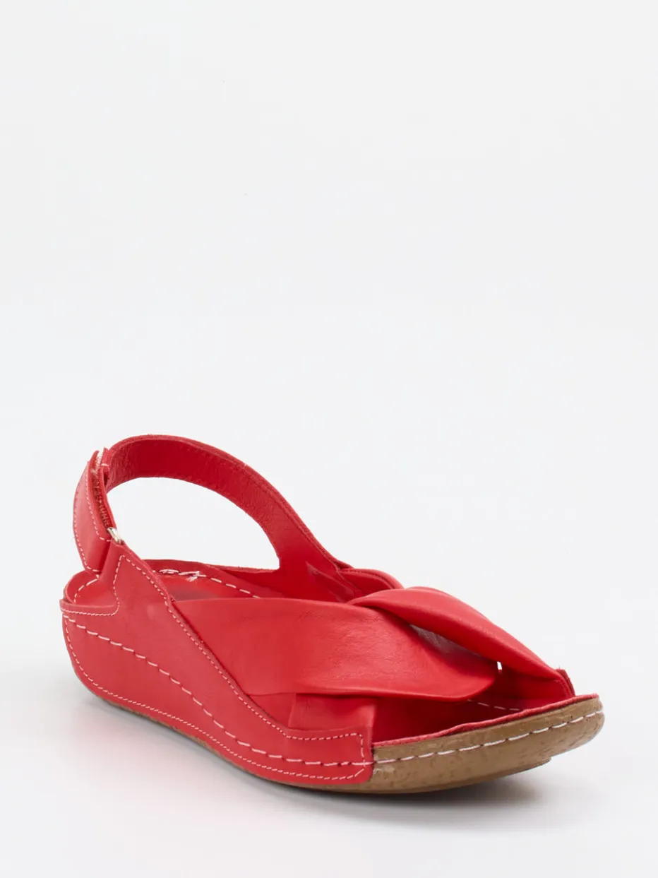 Die Kombination aus rotem Kalbleder, flexibler Gummisohle und ergonomischem Schnitt ergibt eine stilvolle Komfortlösung für entspannte Sommertage.