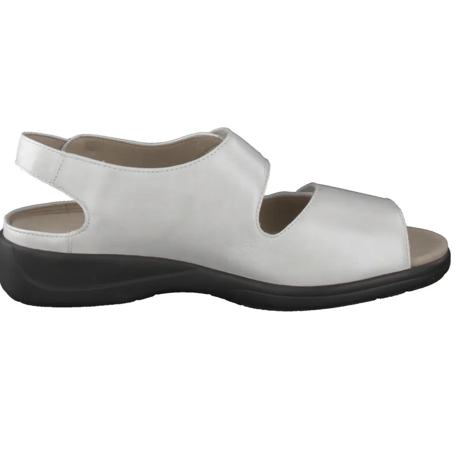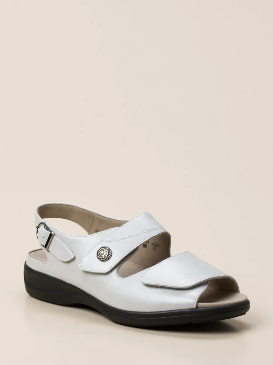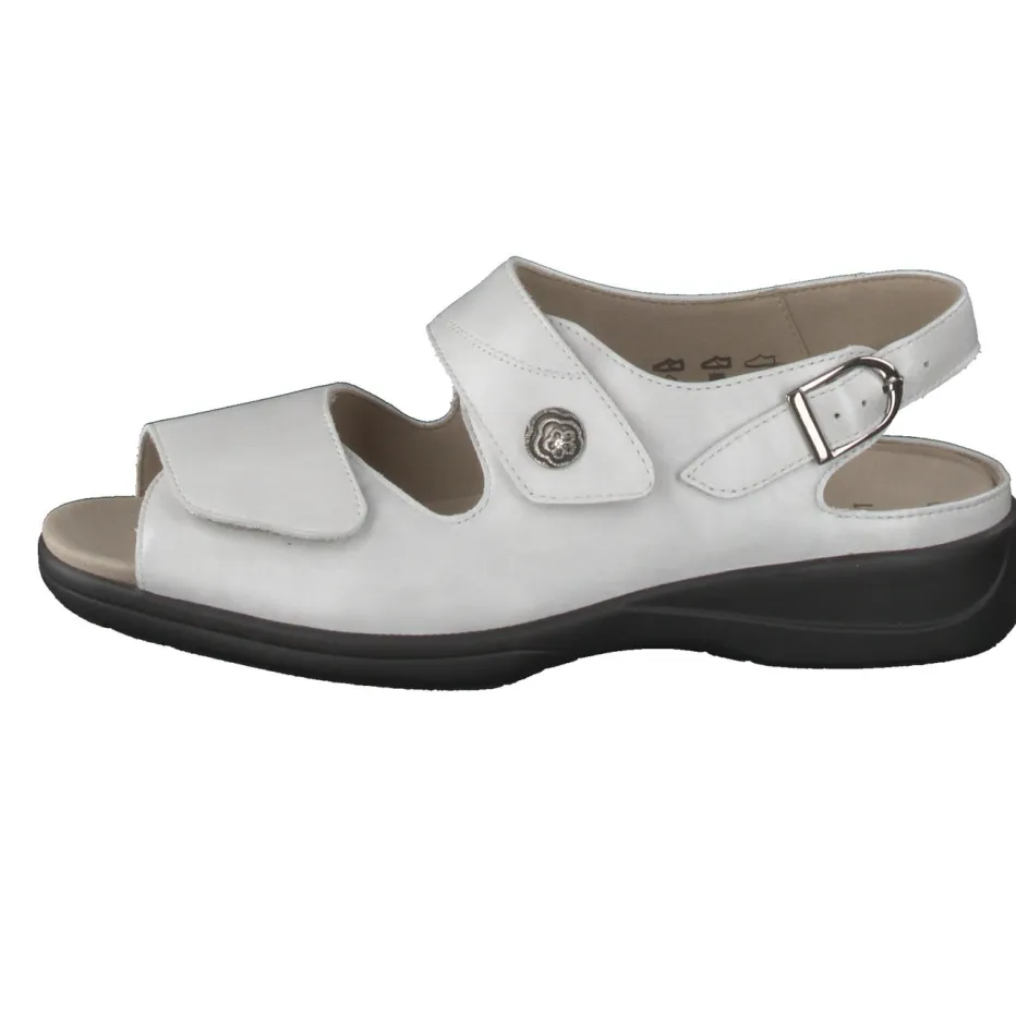 Flexibler Komfort für jeden Tag.Die Marke Solidus präsentiert mit dieser bequemen Komfort-Sandale aus der Linie Solicare Soft ein Modell für gehobene Ansprüche. Ideal für längere Alltagseinsätze bietet die ergonomisch geformte Sandale aus perlgrauem Kalbleder eine rundum angenehme Haptik. Zwei breite Klettverschlüsse und ein verstellbarer Fersenriemen mit silberfarbener Schnalle ermöglichen individuellen Halt. Ein floraler Metallknopf mit Strassakzent setzt einen femininen Akzent. Die schwarze PU-Sohle mit Luftpolster und das herausnehmbare Wechselfußbett machen sie besonders geeignet für Einlagenträgerinnen. Dezentes Design trifft auf funktionelle Details – passend zum Trend „Quiet Wellness“. Verlässlicher Komfort mit orthopädischer Eignung – typisch Solidus.