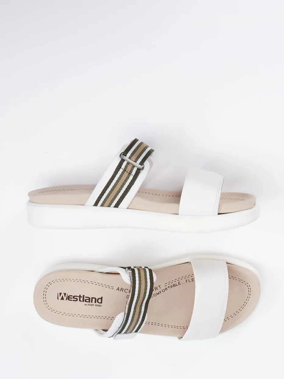 Leichtigkeit trifft auf Komfort.Westland präsentiert eine komfortorientierte Damen-Pantolette für den Sommer. Ein anschmiegsames Fußbett unterstützt ganztägig – sei es beim Strandspaziergang oder im Stadtbummel. Weißes Kalbleder mit mattierter Oberfläche wird durch ein mehrfarbig gestreiftes Textilband in Naturtönen und grünem Klettverschluss ergänzt. Die offene, flache Silhouette unterstreicht die klare Linienführung. Der praktische Klettverschluss sorgt für passgenauen Halt, während die rutschfeste Gummisohle sicheren Tritt bietet. Inspiriert von Minimalismus und „Quiet Luxury“ zieht sie Komfortliebhaberinnen mit casual Stil an. Ein verlässlicher Sommerbegleiter mit dezentem Trendcharakter – typisch Westland.
