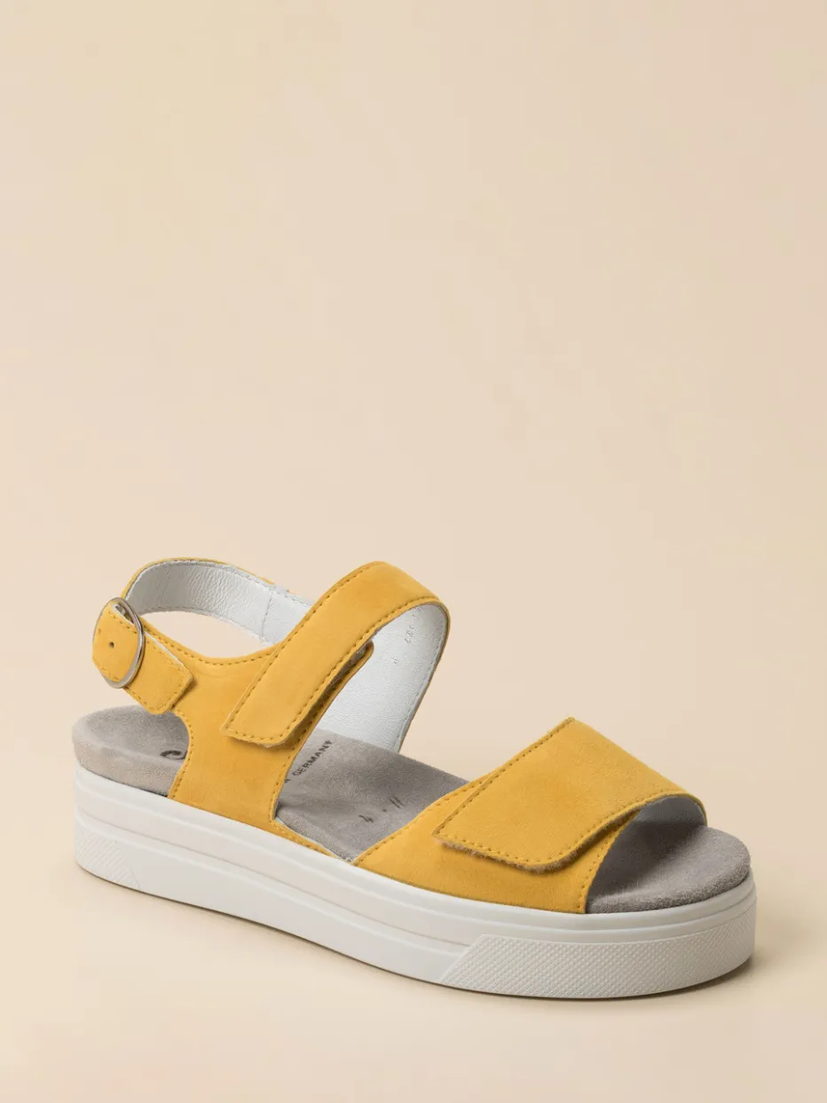 Die Marke Semler präsentiert eine komfortorientierte Plateau-Sandale aus der Linie Anna. Als verlässlicher Begleiter im Alltag oder im Urlaub punktet das Modell mit hochwertigem Veloursleder in leuchtendem Gelb.