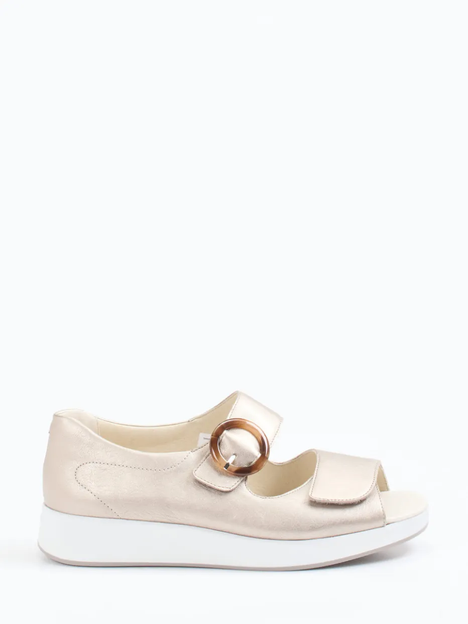 Sommerkomfort mit Stil.Solidus präsentiert eine Komfort-Sandalette, die formschöne Bequemlichkeit mit modernem Minimalismus verbindet. Für relaxte Auszeiten oder den Alltag lässt sich diese Sandalette vielseitig tragen. Das leicht glänzende Metallicleder in Champagner-Beige wirkt hochwertig und stilsicher, ergänzt durch eine geschlossene Fersenkappe und die offene Zehenpartie. Eine dekorative Schnalle in Hornoptik und ein verstellbarer Klettverschluss sorgen für ein anpassbares Tragegefühl. Die dämpfende Keilsohle unterstützt komfortables Gehen – selbst an warmen Tagen. Perfekt zu hellen Naturtönen und pastelligen Sommeroutfits. Solidus verbindet Passform, Funktionalität und dezente Eleganz.