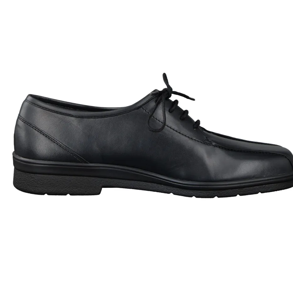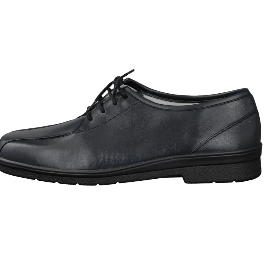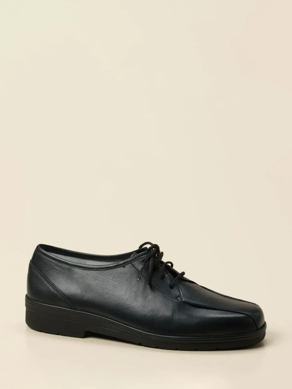 Weiches Kalbleder mit matter Oberfläche und Ton-in-Ton-Nähten sorgt für einen gepflegten Auftritt. Die dunkelblaue Farbe verleiht dem Schuh dezente Eleganz, während die ergonomische 5-Loch-Schnürung und die stoßdämpfende Gummisohle mit Luftpolster maximalen Tragekomfort sichern. Die klassische, niedrig geschnittene Silhouette unterstützt ein vielseitiges Styling – von Stoffhose bis Business-Kleid. Individualisierbar dank Einlageneignung und perfekter Passform in Weite G.