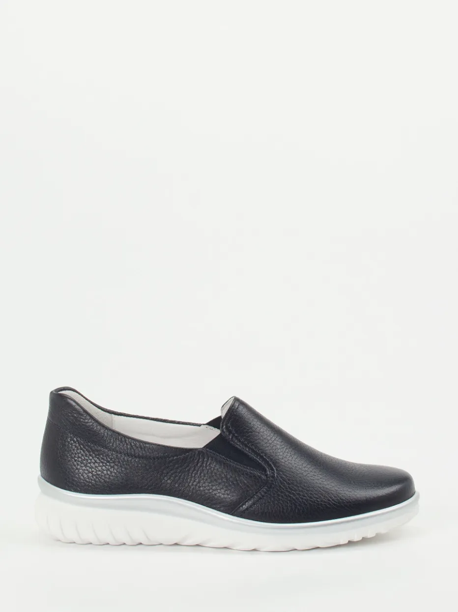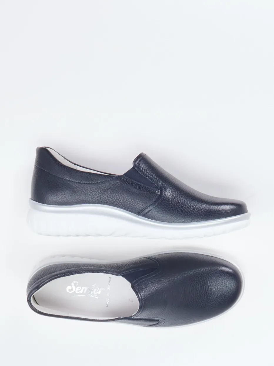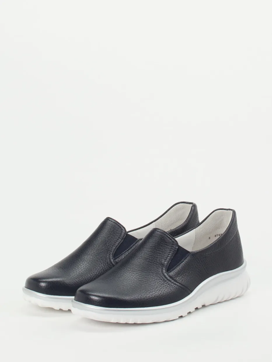 Ideal für entspannte Tage im Alltag bietet dieser Slipper höchsten Tragekomfort durch geschmeidiges, genarbtes Hirschleder in tiefem Blau und weich gepolsterte Details. Elasteinsätze erleichtern den Einstieg und sorgen für passgenauen Halt. Die weiße Keil-Gummisohle mit silbernem Kontraststreifen unterstreicht den minimalistischen Look und bietet rutschhemmende Sicherheit. Durch das herausnehmbare Fußbett ist er auch für Einlagen geeignet, perfekt für modeaffine Komfortliebhaberinnen.