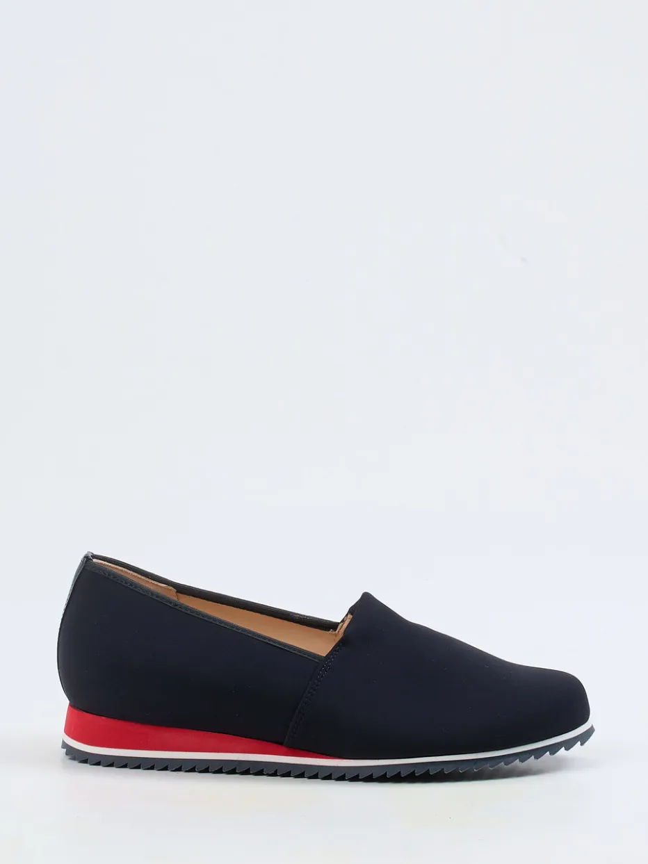 Gelungene Verbindung von Komfort und Design.Hassia präsentiert einen Damen-Komfort-Slipper, der modernes Understatement mit funktionellen Details vereint. Ob beim Stadtbummel oder zuhause – das elastische Textilobermaterial schmiegt sich angenehm an den Fuß und kombiniert matten Look mit einem glänzenden Lackdetail an der Ferse. Die tiefschwarze Grundfarbe wird durch rot-weiße Kontraststreifen an der zweifarbigen Keilsohle akzentuiert. Innen sorgt ein gepolstertes Lederfutter für angenehmes Tragegefühl, das Vario-Fußbett lässt sich durch eigene Einlagen ersetzen. Der sportlich-inspirierte Schlupfschuh zeigt sich trendsicher in Color-Blocking und Streetwear-Stil. Hassia-Komfort für anspruchsvolle Alltagsmomente mit minimalistischem Chic.