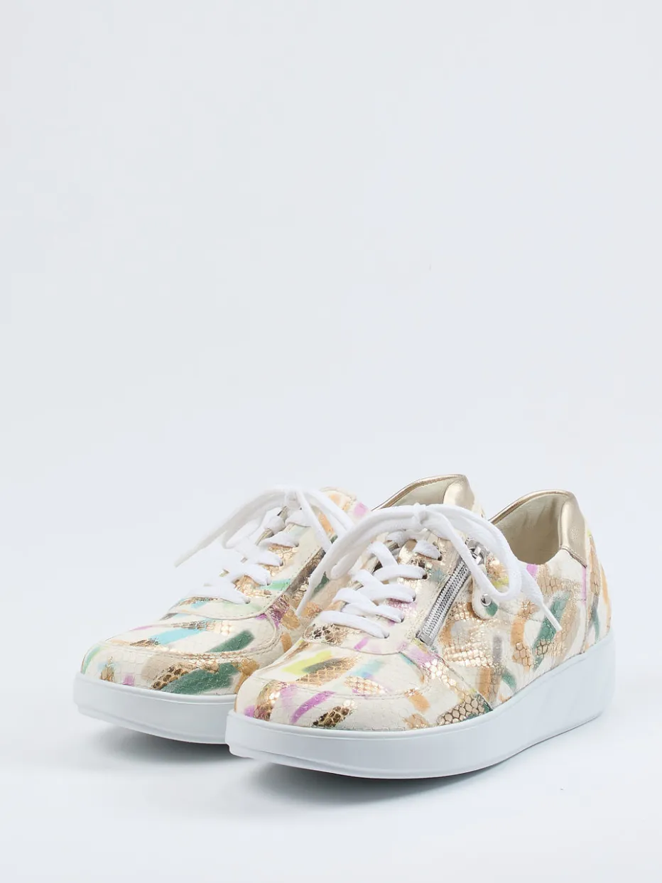 Modischer Komfort für jeden Tag.Waldläufer präsentiert einen Damen-Komfort-Sneaker in stilbewusster Ausführung. Ideal für Frühjahr und Sommer bietet dieser Sneaker in bequemer Weite K eine angenehme Unterstützung im Alltag. Das geprägte Leder mit dezenter Reptilstruktur und schimmerndem Finish vereint Cremeweiß mit pastellfarbenen Akzenten in Mintgrün, Flieder und Gold. Die klassische Rundform mit toniger Zunge und seitlichem Reißverschluss sorgt für ein leichtes Anziehen. Das ergonomische Wechselfußbett, gepaart mit einer stoßdämpfenden PU-Sohle, verspricht ganztägigen Komfort. Metallic-Details setzen zudem feminine Highlights im Trendfeld Modern Femininity. Waldläufer steht für Komfort in hochwertiger Verarbeitung mit modischem Anspruch.