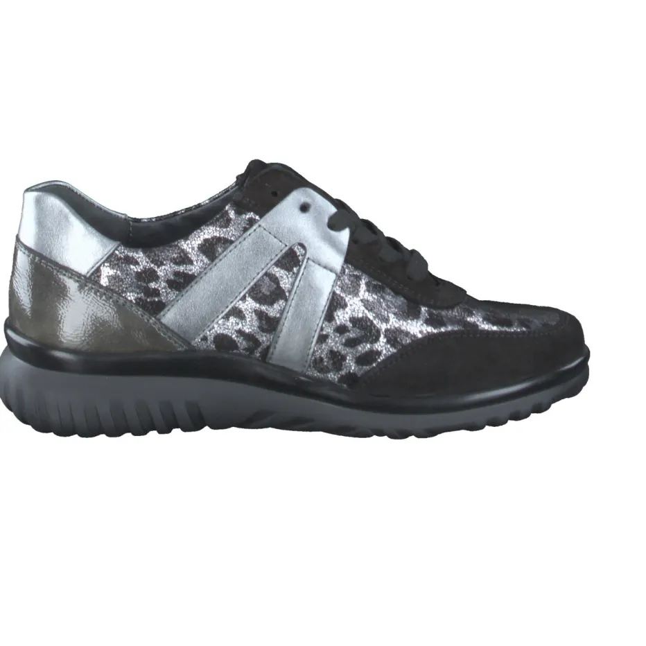 Ideal für urbane Alltagswege besticht das Modell durch geprägtes Leder mit changierendem Metallic-Finish in Grau und Silber. Veloursleder und glänzendes Textil mit Animalprint sorgen für eine ausdrucksstarke Textur. Die klassisch-runde Silhouette bietet mit gepolstertem Schaftrand und Weite H besonderen Komfort. Eine schwarze Schnürung erleichtert die individuelle Passformanpassung, während die profilierte Gummisohle mit Keilabsatz sicheren Tritt gewährleistet. Ein Wechselfußbett unterstreicht den funktionalen Anspruch. Perfekt kombinierbar mit dunklen Casual-Looks oder silberfarbenen Accessoires.