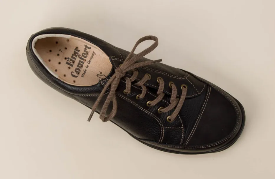 Bewährter Komfort für entspannte Schritte.Finn Comfort präsentiert mit diesem Schnürschuh einen modernen Komfort-Sneaker für den Alltag. Ideal für lange Wege oder entspannte Tage zu Hause überzeugt das Modell durch eine Kombination aus genarbtem Kalbleder und samtigen Veloursdetails in Dunkelbraun und Beige. Die klassische Silhouette mit runder Form, beige Kontrastnähte und messingfarbene Ösen unterstreichen den klaren Stil. Die gepolsterte Schaftrandpartie sowie das herausnehmbare Korkfußbett ermöglichen individuellen Tragekomfort, unterstützt durch eine dämpfende Gummisohle. Im Normcore-Stil interpretiert, passt er perfekt zu entspannten Freizeitlooks. Ein hochwertiger Schuh mit gesunder Funktion – gefertigt mit Sorgfalt von Finn Comfort.