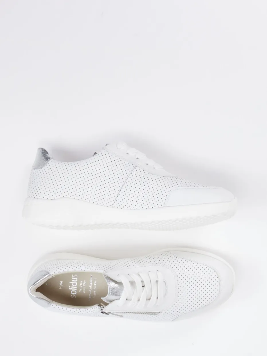 Leichter Begleiter an warmen Tagen.Solidus präsentiert mit diesem Komfort-Sneaker einen stilvollen Alltagsbegleiter für Damen. Ob Stadtbummel oder entspannter Spaziergang: Das perforierte Kalbleder in Offwhite sorgt in Kombination mit dem anschmiegsamen Leder-/Textilfutter für ein luftiges Tragegefühl. Dezente Glanzeffekte an Ferse und Zunge in Silber verleihen dem rund geformten Modell mit Schnürung und Reißverschluss ein modernes Finish. Die flexible Gummisohle mit Wabenprofil bietet sicheren Halt, während die herausnehmbare Innensohle individuelle Anpassung ermöglicht. Der reduzierte Materialmix verleiht dem Schuh eine minimalistische Anmutung mit Streetwear-Akzent. Solidus steht hier für zuverlässigen Komfort und hochwertige Verarbeitung in zeitgemäßem Design.