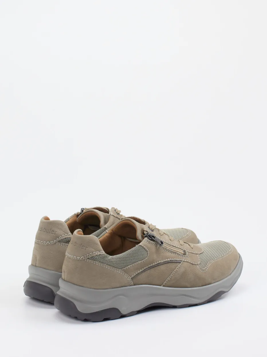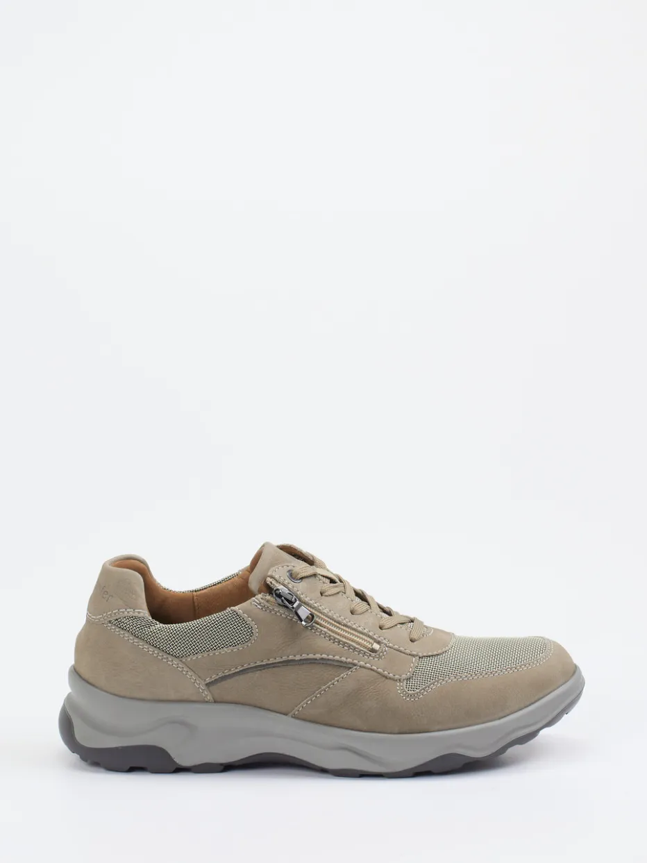 Ob beim Stadtbummel, Spaziergang oder im Alltag – der beigetönige Mix aus samtig genarbtem Kalbleder und atmungsaktivem Mesh passt sich jedem Moment bequem an. Der gepolsterte Schaftrand und die funktionale Kombination aus Schnürung und Reißverschluss ermöglichen ein müheloses Anziehen. Die stark profilierte Gummisohle mit gelenkschonender Luftpolsterung verleiht dem Modell Trittsicherheit und Komfort. In Form und Farbe zurückhaltend, passt der Sneaker perfekt zu ruhigen Freizeitlooks im „Quiet Comfort“-Trend.