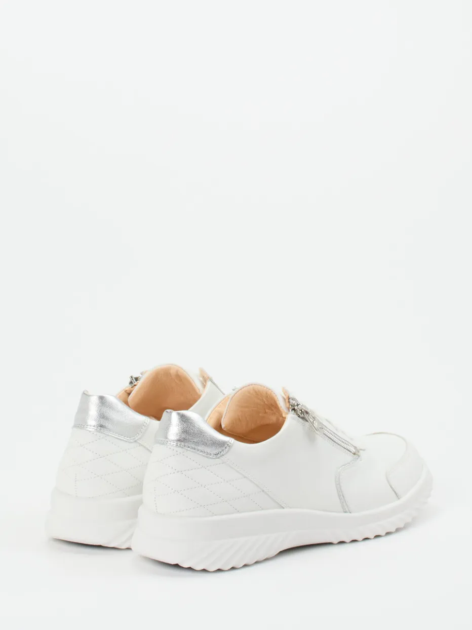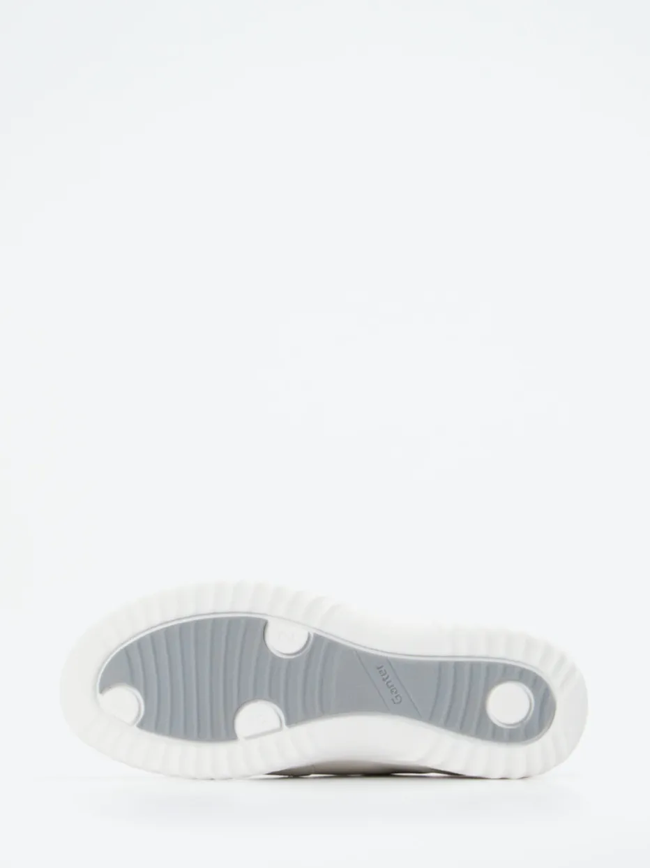 Minimalistisch trifft funktional.Ganter präsentiert mit diesem Damen-Komfort-Sneaker ein Modell aus hochwertigem Kalbleder. Ideal für einen aktiven Tag mit vielen Wegen: Das angenehme Material zeigt eine matt geglättete Oberfläche, ergänzt um eine gesteppte Fersenkappe mit silberfarbenem Besatz. Farblich dominieren Weiß und dezente Grautöne, moderne Akzente setzen Reißverschluss und Details in Metallic. Der klassische, abgerundete Schnitt wird durch eine flexible 4-Punkte-Sohle, gepolsterte Ferse und ein herausnehmbares Fußbett unterstützt. Inspiriert von „Quiet Luxury“ fügt sich der Schuh mühelos in entspannte Alltagslooks ein. Hochwertige Verarbeitung kombiniert mit funktionalem Komfort – typisch Ganter.