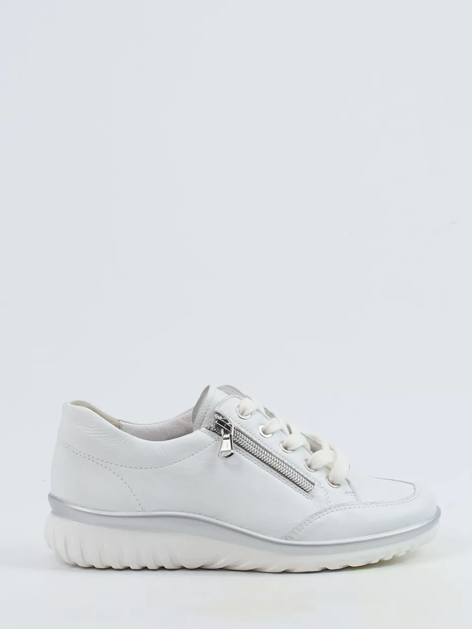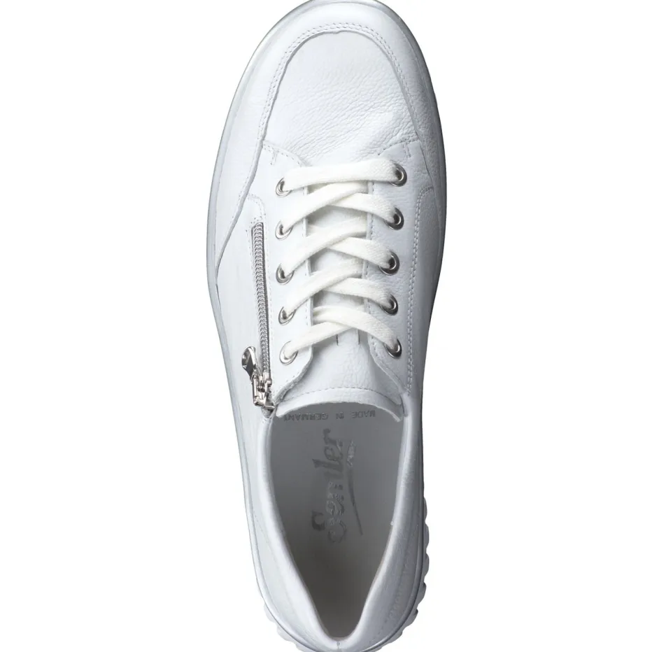 Minimalistisch und funktional.Die Marke Semler präsentiert mit diesem Komfort-Sneaker ein Modell für Damen, das Alltagstauglichkeit elegant interpretiert. Ideal für entspannte Tage auf den Beinen bietet der Schuh dank gepolstertem Wechselfußbett, luftgepolsterter PU-Sohle und angenehmer Weite H ein spürbares Komforterlebnis. Das weiße Kalbleder zeigt sich hochwertig genarbt und wird durch silberne Details wie Reißverschluss und Sohlenkante modisch akzentuiert. Die runde Silhouette mit Schnürung und seitlichem Zip ergänzt den sportiv-eleganten Auftritt. Stilistisch bewegt sich das Modell zwischen Quiet Luxury und funktionalem Chic der Saison. Ein femininer Begleiter mit Fokus auf Komfort und Anspruch.