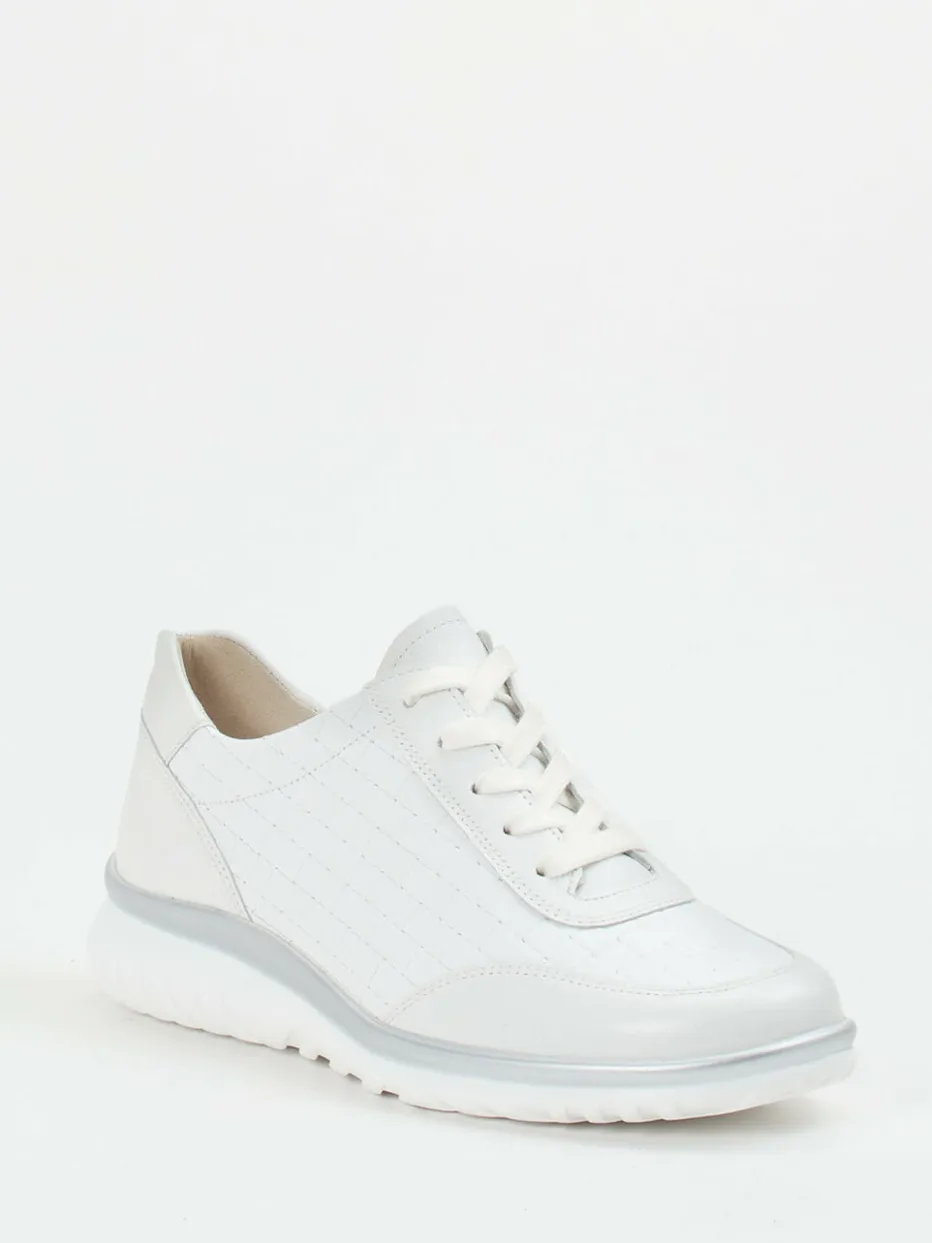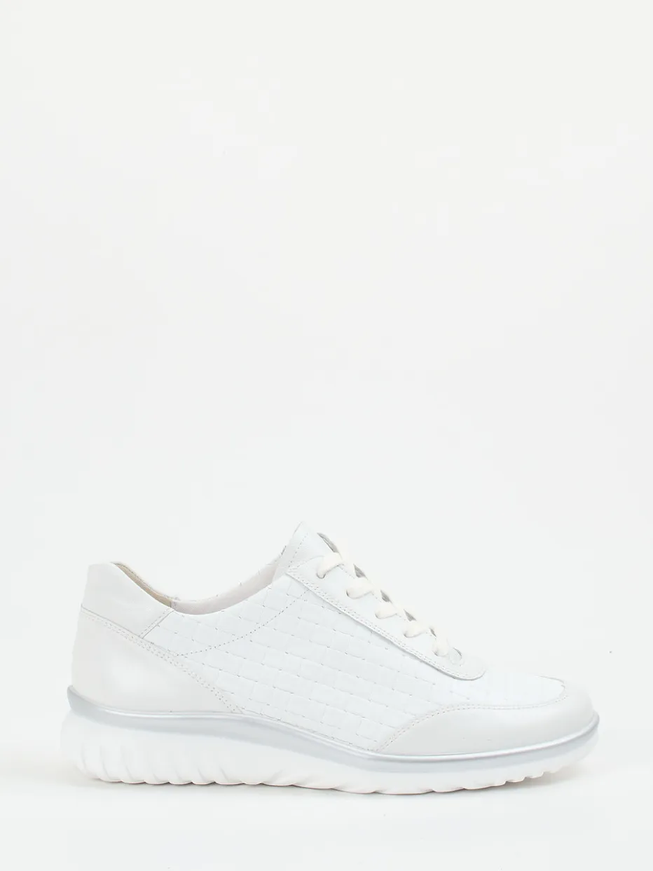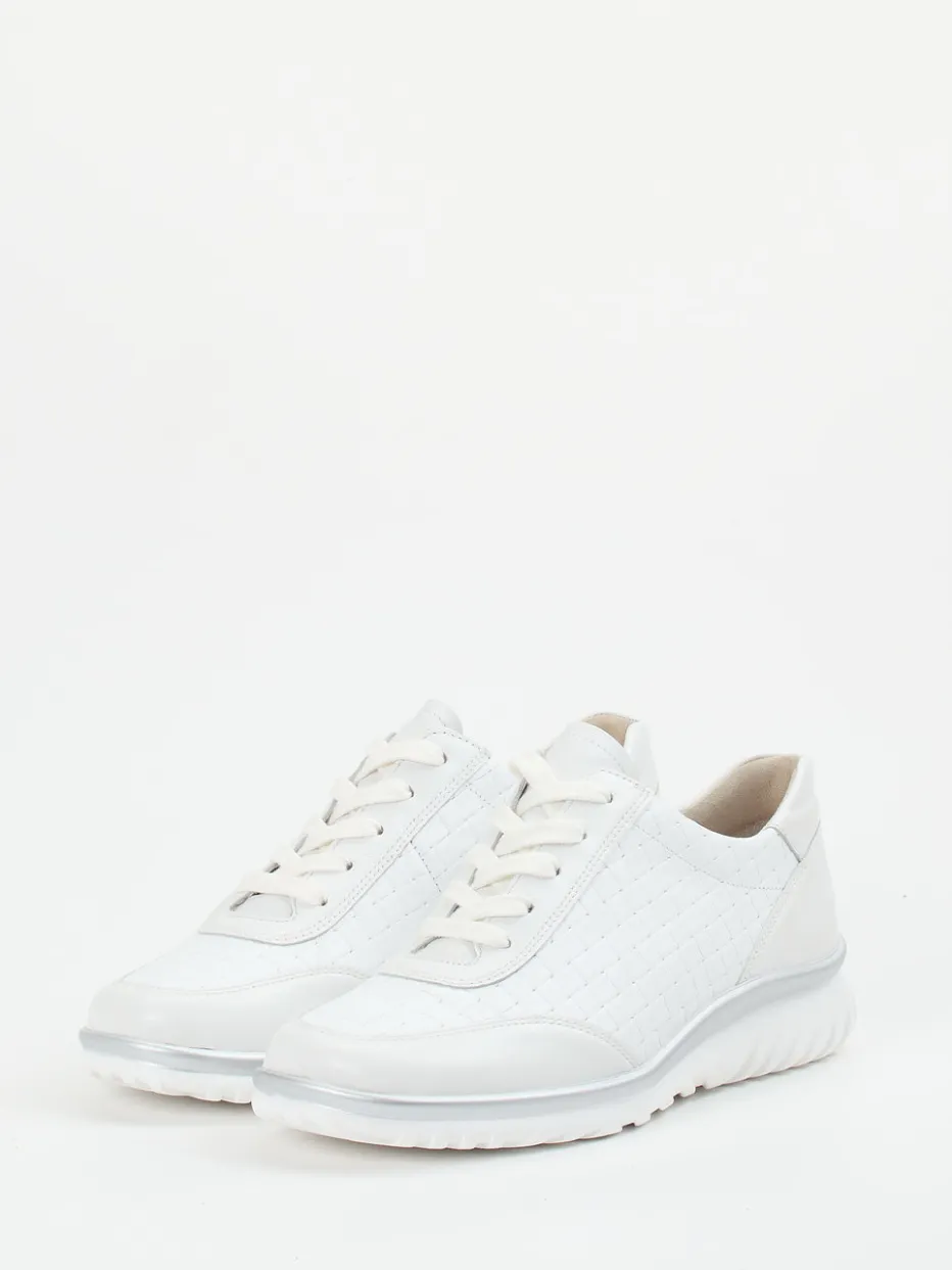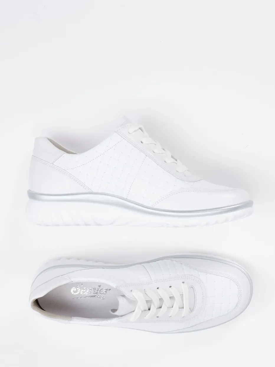 Eleganz mit sportivem Komfort.Semler präsentiert diesen weißen Komfort-Sneaker für Damen aus der Linie Lena. Ideal für entspannte Stadtrundgänge oder stilvolle Alltagslooks: Das feine, an den Seiten dezent geflochten wirkende Kalbleder besitzt eine matte Oberfläche und wird durch tonige Nähte und einen silberfarbenen Akzent an der Mittelsohle raffiniert abgerundet. Die sportlich-runde Silhouette mit Schnürung und zusätzlichem Reißverschluss sorgt für flexible Weiteneinstellung. Innen überzeugt der Schuh mit atmungsaktivem Leder-/Textilfutter und gepolsterter, auswechselbarer Decksohle. Der Look folgt der Ästhetik des „Quiet Luxury“. Die luftgepolsterte PU-Sohle unterstützt gelenkschonend und komfortorientiert.