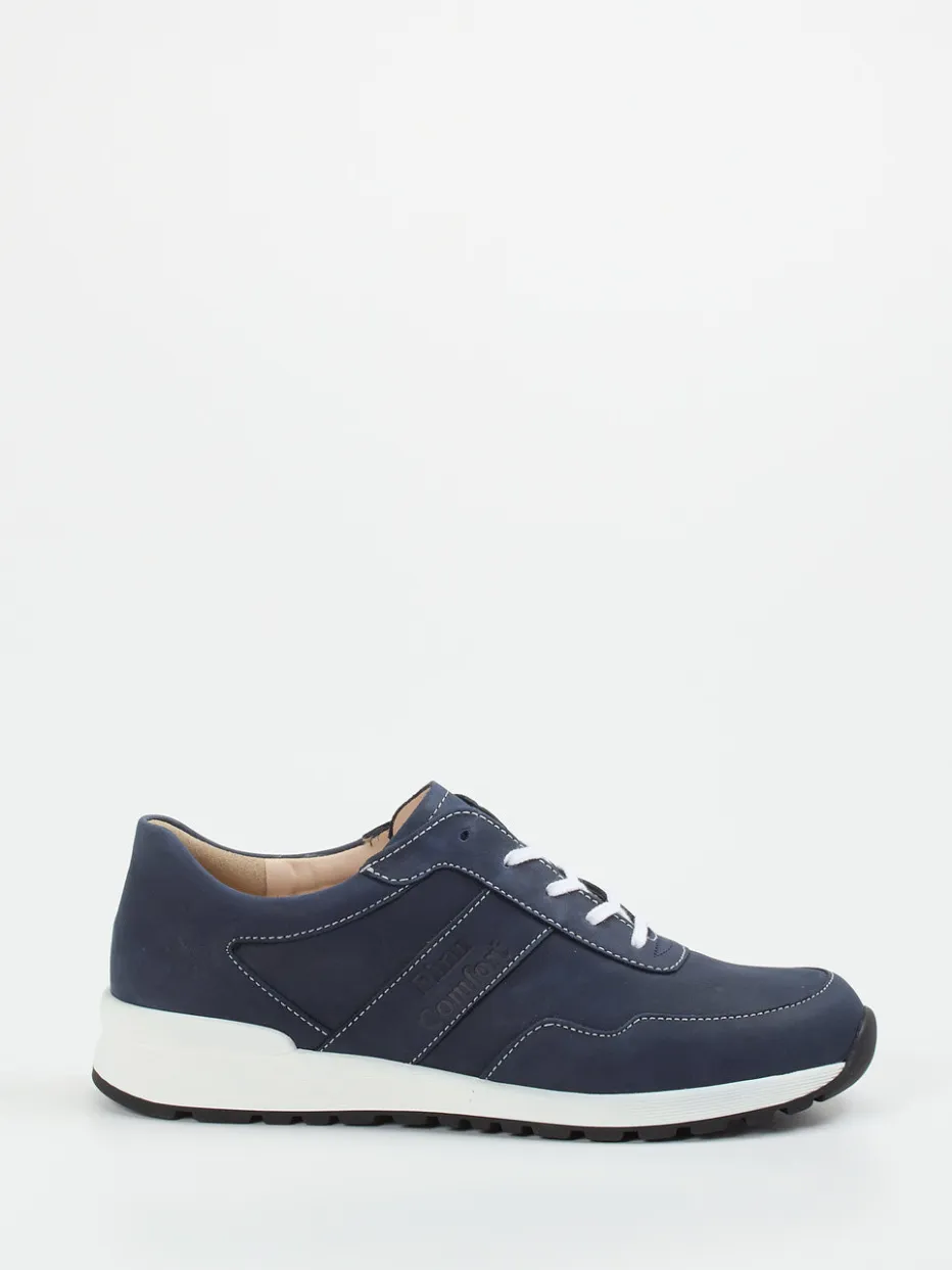 Durchdachter Komfort trifft zeitlose Optik.Finn Comfort bietet mit diesem Komfort-Sneaker für Herren eine gelungene Kombination aus Funktion und Understatement. Für entspannte Alltagseinsätze im urbanen Umfeld eignet sich dieses Modell hervorragend. Das Obermaterial aus samtig angeschliffenem Nubukleder in Dunkelblau erhält durch weiße Kontrastnähte und eine schwarz-weiße Profilsohle eine sportlich strukturierte Wirkung. Die klassische Schnürung, geprägte Logos und ein gepolsterter Schaftrand betonen den retro-inspirierten Look. Die flexible Gummisohle mit ergonomischem Profil und das Lederinnenfutter mit Korkfußbett garantieren hohen Tragekomfort. Stilistisch passt der Sneaker zu Casual-Looks mit Jeans und Polo-Shirt. Markentypische Funktionalität für langanhaltenden Komfort im Alltag.