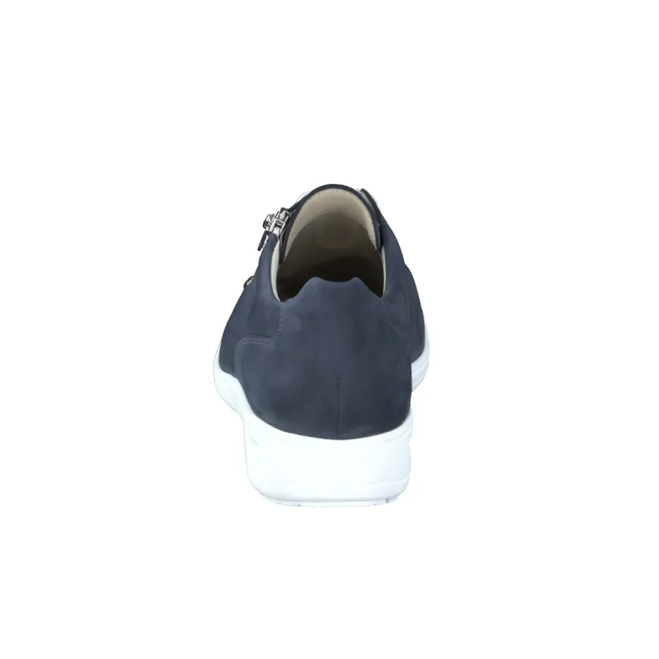 Stilsicher durch jeden Alltag.Solidus präsentiert einen Damen-Komfort-Sneaker, der Schlichtheit und Funktion clever vereint. Ideal für entspannte Alltagsmomente oder gemütliche Stadtbummel: Das handschuhweiche Nubukleder mit matter Oberfläche wird durch glitzernde Lurexfäden in der weißen Schnürung stilvoll ergänzt. Dunkelblau trifft auf klare Linien und silberfarbene Elemente wie den funktionalen Reißverschluss. Innen sorgt ein lederbezogenes Luftpolster-Fußbett für spürbaren Komfort, unterstützt durch die weiße Gummisohle in dezenter Keilform. Der cleane Look mit minimalistischem Einfluss harmoniert mit casual Outfits wie Jeans und Softshelljacke. Für komfortbetonte Mode mit hochwertigem Designanspruch.