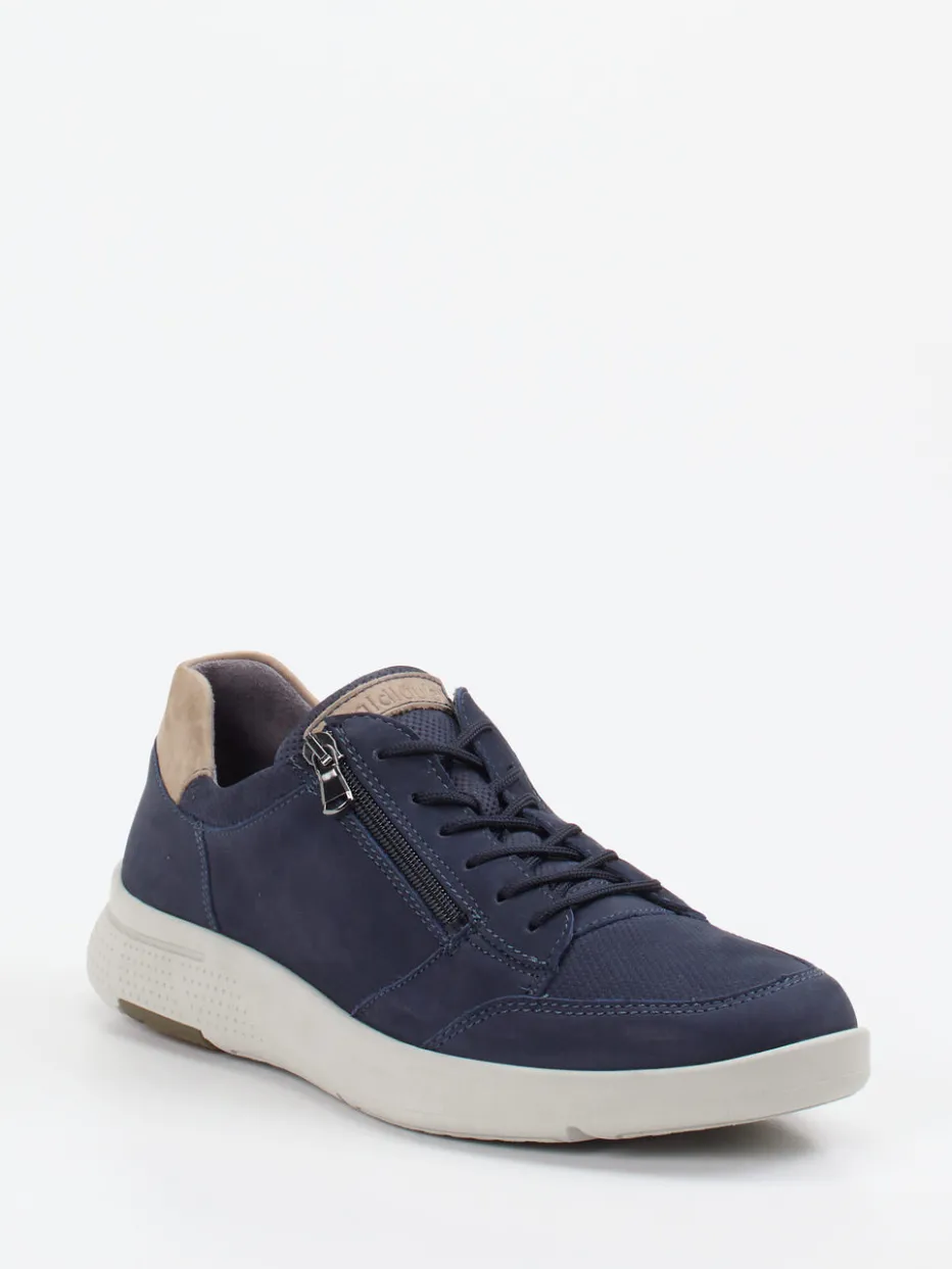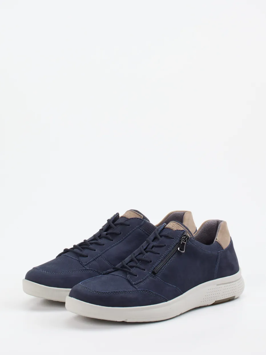 Ideal für entspannte Freizeitstunden bietet das Modell ein Obermaterial aus Nubukleder, samtig angeschliffen und in markantem Dunkelblau. Beige Kontrastbesätze an der Ferse und helle Gummisohlen schaffen dezente Highlights im Ton-in-Ton-Design. Die Kombination aus Schnürung und seitlichem Reißverschluss erleichtert den Einstieg, während das gepolsterte Innenfutter den Fuß angenehm umschließt. Inspiriert von aktuellen Streetwear-Trends, punktet der Schuh mit funktionalem Komfort und stilistischer Zurückhaltung. Besonders passend zu Chinohose oder Funktionsjacke.